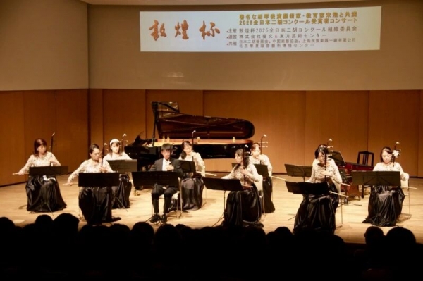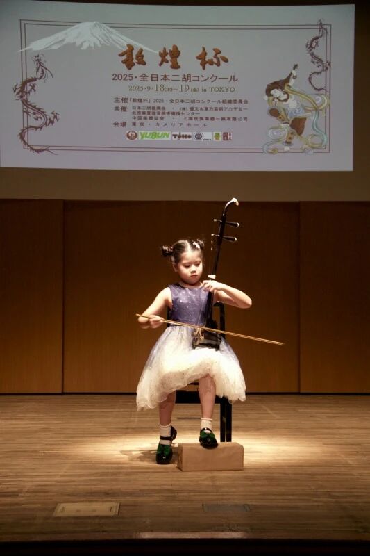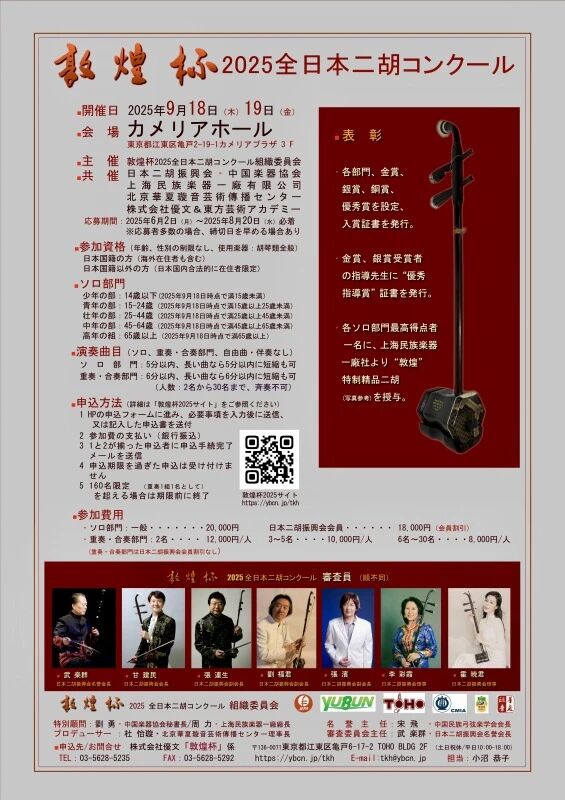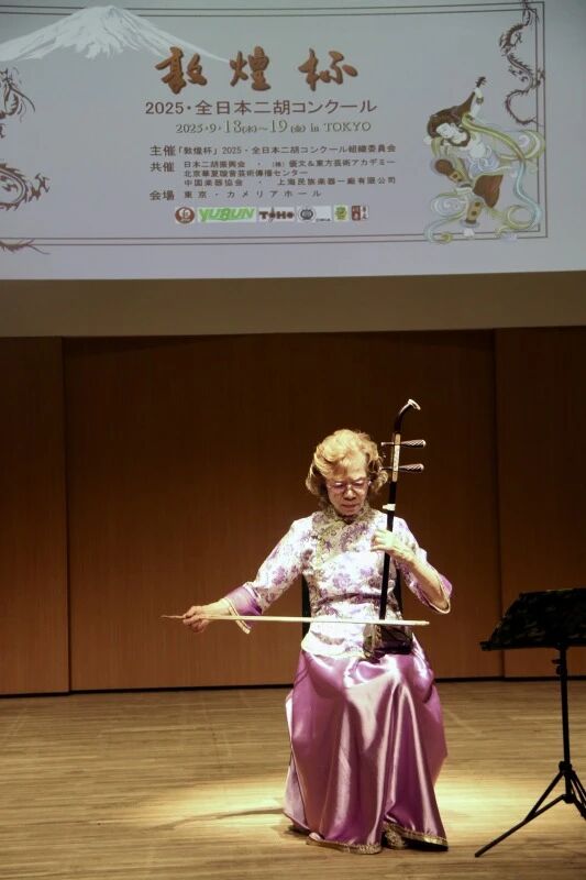 2019年在日本、新加坡、北美和澳大利亚举办了首届“敦煌杯”赛事,特别是在日本的比赛涉及范围广,影响面大,深受广大日本二胡专业人士以及爱好者的欢迎和积极参与。今年9月18日至19日在东京举办了“敦煌杯2025・全日本二胡比赛”,来自日本全国各地的170名选手在六个组别中进行角逐。比赛按着日本厚生劳动省颁发的年龄设置组别,14岁以下为少年组,15岁至24岁为青年组,25岁至44岁为壮年组,45岁至64岁为中年组,65岁以上为老年组。每个组别设有金奖,银奖,铜奖,优秀奖,各个组别最高分得主还颁发了上海民族乐器一厂为大赛特制的老红木精品二胡。