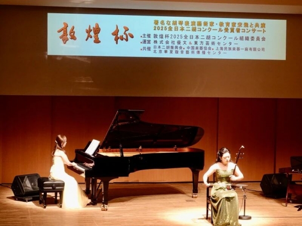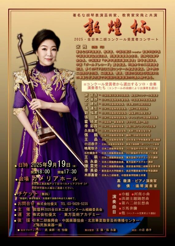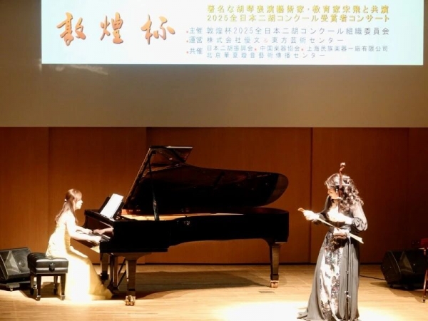 19日晚6点在比赛现场东京卡梅利亚音乐厅举办了“敦煌杯2025・全日本二胡比赛获奖选手暨与著名胡琴表演艺术家、教育家宋飞共演音乐会”。宋飞院长不仅在中国在日本二胡界也同样享有盛名。为了聆听宋飞院长的演奏,晚上6点开演的音乐会不到4点已经在音乐厅外排起的长队从三楼延至到二楼。前几次宋飞院长来日本都是参加中日两国国家举办的庆典音乐会,时隔近二十年再渡日本是许多粉丝难得的一次近距离观赏其演奏的机会,其他参演者由9位评委共同审核推选出3位独奏和一组合奏出演。