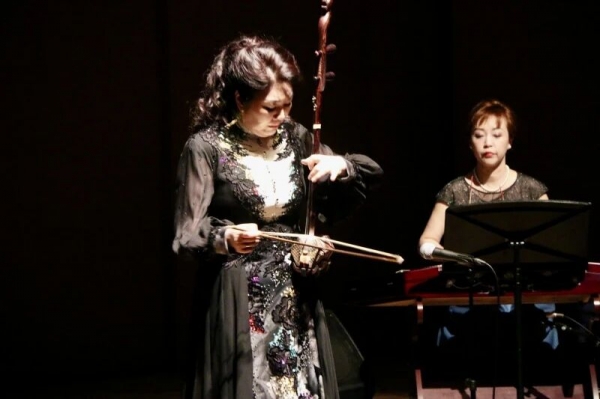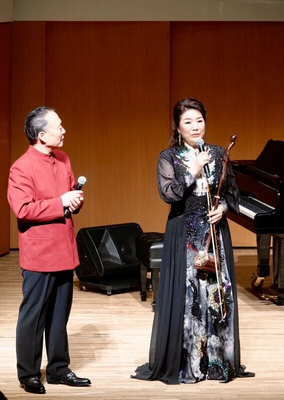 这场音乐会由武乐群主持,他首先简明扼要地介绍了三十余年日本二胡从无到有的历程和“敦煌杯”在日本举办的经纬,然后重点介绍并邀请宋飞登台。还没演奏台下的掌声经久不息。宋飞演奏的第一首曲目是“洪湖主题随想曲”,扬琴伴奏由旅日扬琴演奏家李倩担任。这首乐曲是歌剧“洪湖赤卫队”的著名唱段,在中国家喻户晓,改编的二胡独奏曲通过慢板,快板以及巧妙的变奏,更是增加了乐曲的表现力。宋飞的站立演奏不论是慢板长弓的缠绵蕴藉还是快板的慷慨激昂都表现得恰到好处,为音乐会带来了新的高潮。其后宋飞演奏了王云飞为2021年“中国弓弦艺术节”创作的二胡独奏曲“巾帼”,这首乐曲是宋飞首演,在日本也是第一次向观众披露,十几分钟的演奏一气呵成,表现了对千百年中国历史中出现的巾帼英雄们的怀念与歌颂,画卷平舒,气贯长虹。