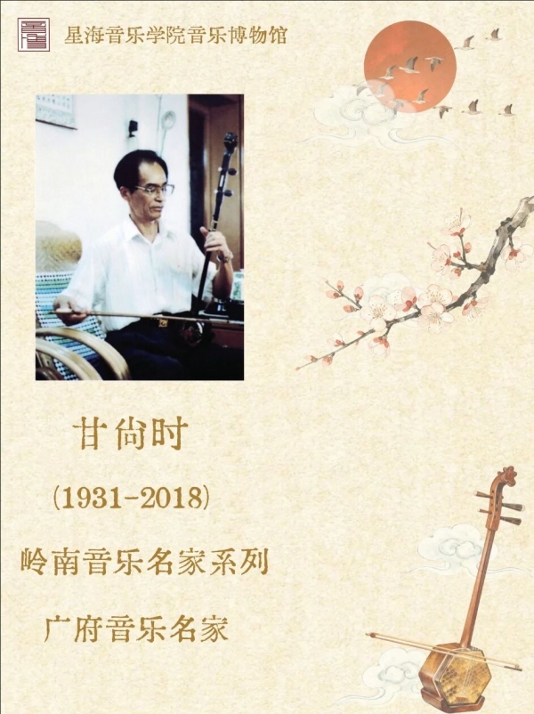 1999年7月16日,星海音乐学院高朋满座,气氛热烈,这里正进行着一次隆重的首发式,出席的传媒单位就有十多家。首发式是专为甘尚时先生所著的《广东音乐荟萃--甘尚时高胡演奏名曲》的正式发行而举办的。甘尚时(1931-2018),出生于广东省信宜市。甘尚时先生是中国音乐家协会会员,中国民族管弦乐学会常务理事中国民族管弦乐学会广东考区执委会主任,中国民族管弦乐学会高胡专家委员会主任,加拿大中乐团顾问,并曾任国际中国民族器乐独奏大赛评委,广东省政协第七届委员会委员等职。甘尚时先生自幼喜欢音乐,读小学和中学时就常常和喜爱音乐的同学一起练习小提琴,同时也开始尝试用高胡演奏广东音乐。在学习期间,他还常聆听广东高胡学派创始人、广东音乐一代名家吕文成先生的唱片,深深地为吕文成先生那炉火纯青的高胡技艺所倾倒,为此他下定决心要学好高胡。从此,甘尚时先生与高胡结下不解之缘。他像着了魔一样迷上了高胡,废寝忘食,经过几十年不懈的努力,他终于成为一位著名的高胡演奏家。