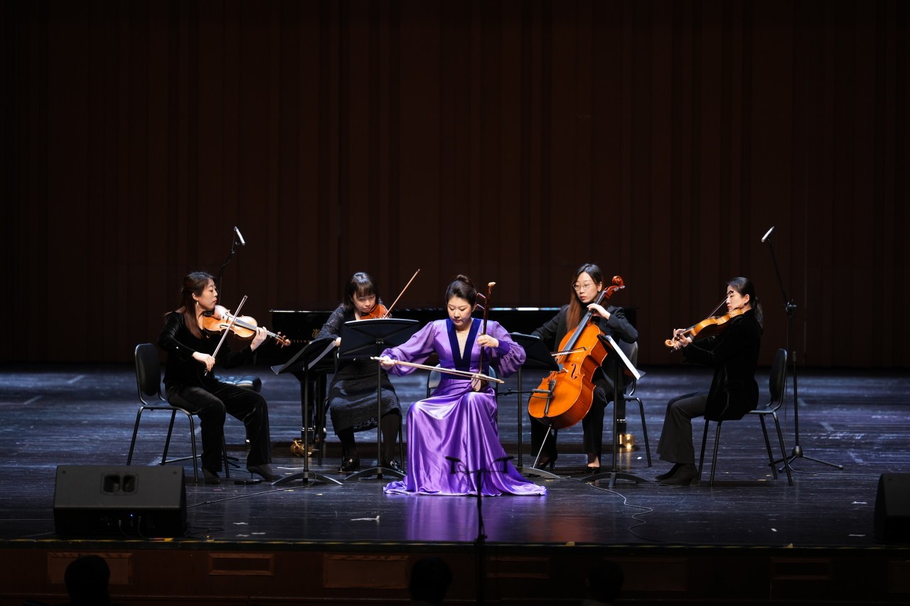 下半场以弦乐四重奏与板胡《幽默曲》(作曲:刘久暄)开场,陆续呈现《浮生若梦》(作曲:笪思甜)、《尘萤》(作曲:李可一)、《窗花绘梦》(作曲:罗成)、《灼》(作曲:姚苏栩)和《一抹红妆》(作曲:赵夺良、赵紫茵)等作品。其中,《窗花绘梦》融陕西民间音乐与窗花剪纸意象,地域风格鲜明;《灼》以火焰为意象,结合秦腔元素,象征板胡艺术薪火相传;压轴曲《一抹红妆》改编自东北民歌《月牙五更》,融入流行、爵士元素,由赵夺良教授与女儿赵紫茵同台演奏,成为“守正创新”的生动写照。
