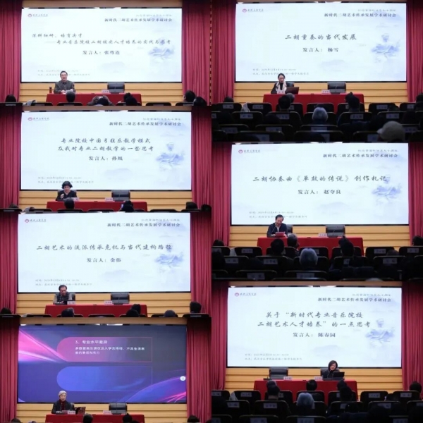 开幕式后,三场专题学术研讨会接续举行,第一场研讨会由宋飞主持,张咏音(浙江音乐学院)、林聪(天津音乐学院)、曹德维(中国音乐学院)、陈军(天津音乐学院)、刘光宇(重庆市音协)、胡志平(武汉音乐学院)、宋飞(哈尔滨音乐学院)聚焦“经典重读与时代传承”,紧扣艺术精神谱系梳理、经典创作逻辑剖析、复合型人才培养路径、“艺术为人民”初心回归、中西经典融合创新实践、作品美学价值深度阐释等关键议题,分享研究成果、交流学术见解;第二场研讨会由陈春园主持,张尊连(中国音乐学院)、梁云江(四川音乐学院)、孙凰(中央音乐学院)、金伟(西安音乐学院)、杨雪(中央音乐学院)、赵夺良(沈阳音乐学院)、陈春园(上海音乐学院)以“教学模式与人才培养”为核心,围绕拔尖创新人才培养路径优化、专业教育发展瓶颈突破、教学方法改革创新、流派传承体系建构、学科与教材体系建设完善等重要内容,展开深入研讨;第三场研讨会由刘光宇主持,赵露雨(武汉音乐学院)、高扬(中国民族管弦乐学会胡琴专业委员会)、孟晓旭(星海音乐学院)聚焦“科技与二胡艺术融合发展”,就新媒体技术在艺术传播中的创新应用、科技服务艺术的功能定位与实践路径、自媒体平台普及推广策略等前沿方向,深入交换思路、凝聚发展合力。三场研讨会气氛热烈、研讨深入,专家学者各抒己见、思想碰撞,为新时代二胡艺术的传承创新与高质量发展凝聚多元智慧、贡献学术力量。