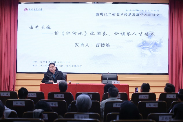胡志平从历史贡献、创新精神与美学价值三个维度,系统阐释了黄海怀先生的艺术地位与时代意义。他表示,研寻黄海怀的艺术精神,学习黄海怀继承、借鉴基础上杰出的艺术创新创造,交流探讨新时代德艺双馨拔尖创新人才培养的模式方法,研讨数字化人工智能条件下中国民族音乐文化的传承传播,对于促进中国民族弓弦乐艺术高质量发展具有重要的价值意义。