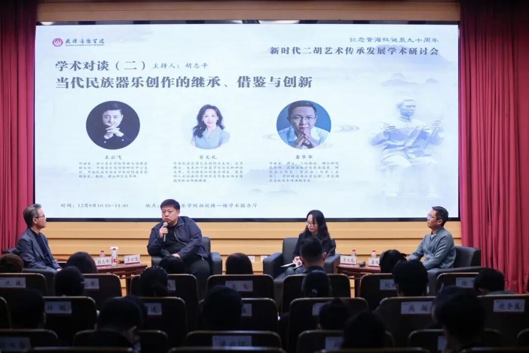 12月9日上午,研讨会举行两场学术对谈,胡志平担任主持。在第一场对谈中,宋飞、唐峰(中央民族乐团)、陈军三位专家围绕“黄海怀杰出艺术创造的启示意义”展开深入交流,从多个维度解读黄海怀二胡艺术精神的当代价值。第二场对谈则聚焦“当代民族器乐创作的继承、借鉴与创新”,王云飞(浙江音乐学院)、肖文礼(中央民族乐团)、龚华华(武汉音乐学院)三位专家结合自身创作和研究实践,探讨中国优秀传统音乐文化资源与现代专业音乐创作理念的融合路径,为民族器乐创作提供了新的思路。