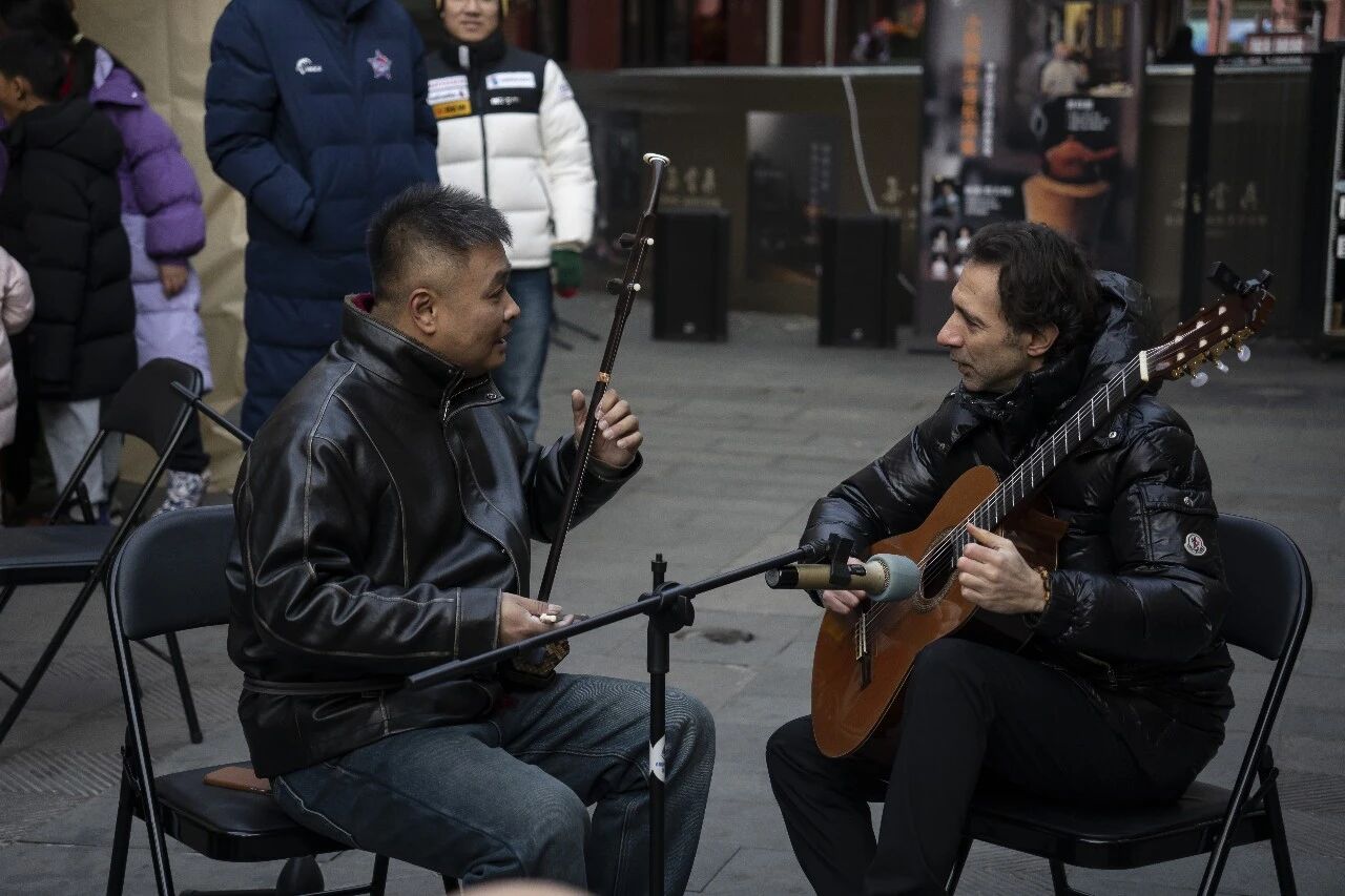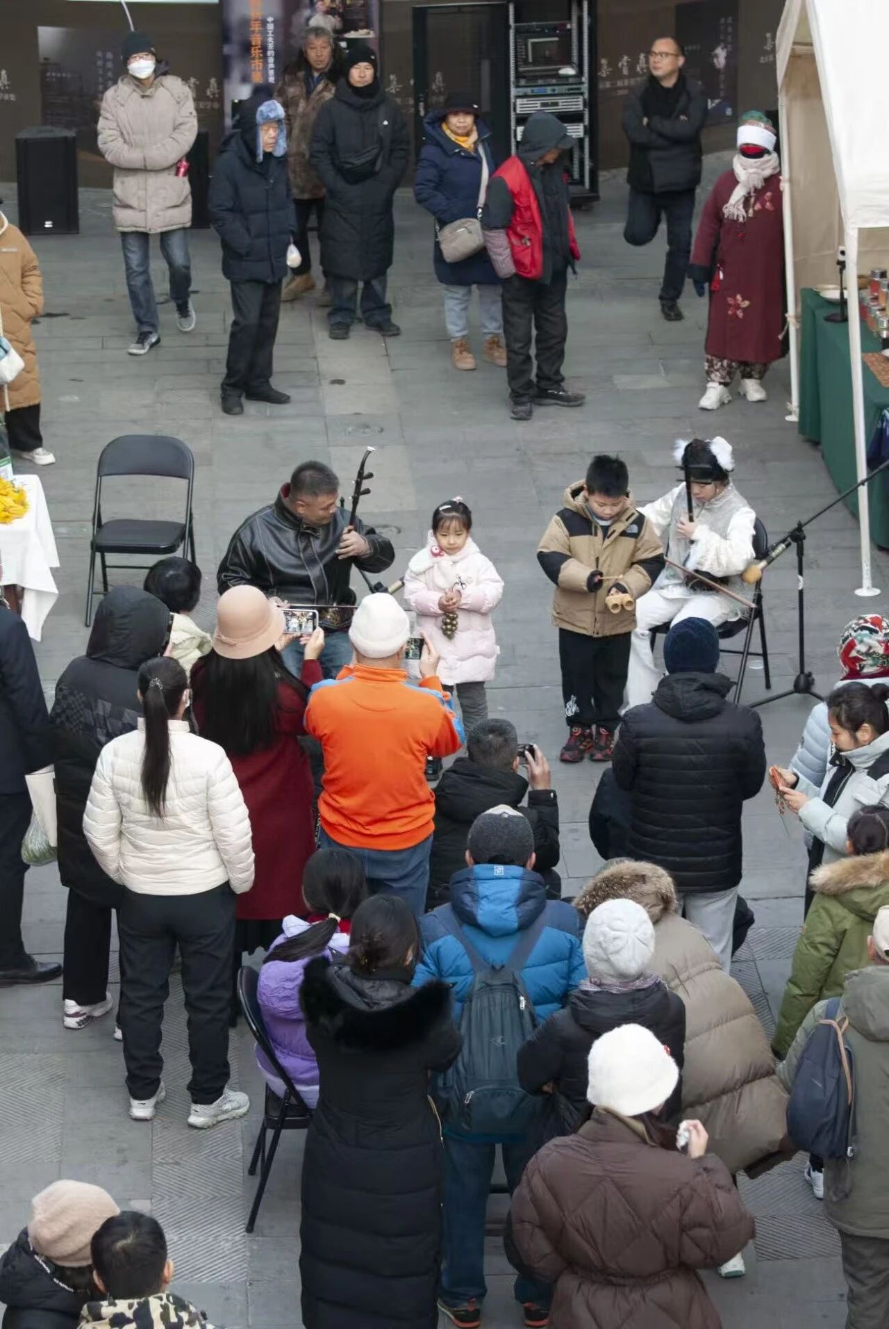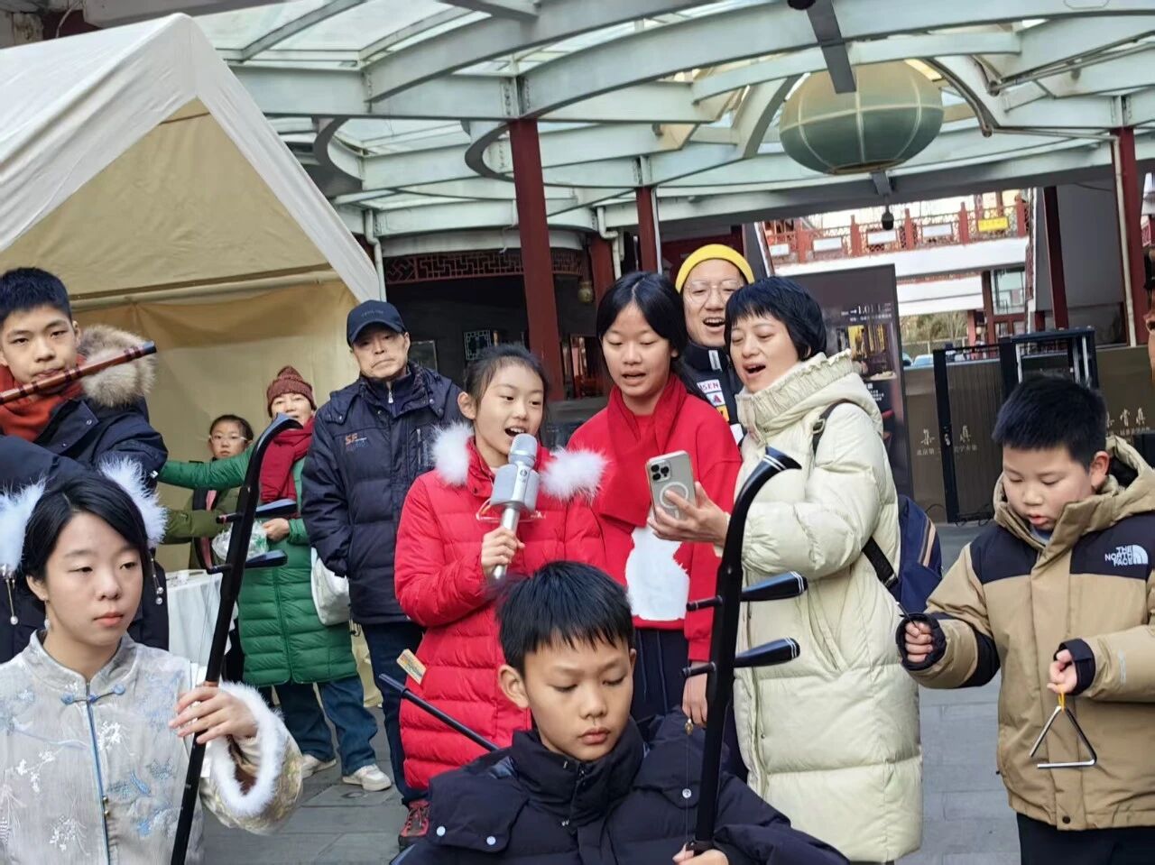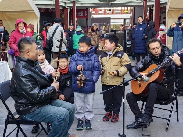 当《茉莉花》的旋律响起,现场气氛逐渐升温。这首经典曲目既传递出节日的喜悦,也寄托着冬日里对春天的向往。此外,团队还演绎了《四季歌》等多首民歌。为照顾老年观众,古筝演奏了《北京的金山上》。适逢马年,演出也融入武侠音乐元素:如成龙电影《醉拳》插曲《市集》,轻快的节奏与市集主题相映成趣;竹笛独奏《刀剑如梦》激昂慷慨,引人仿佛踏入武侠世界;《赛马》则以奔腾的旋律,将听众带入辽阔草原的意象中。
