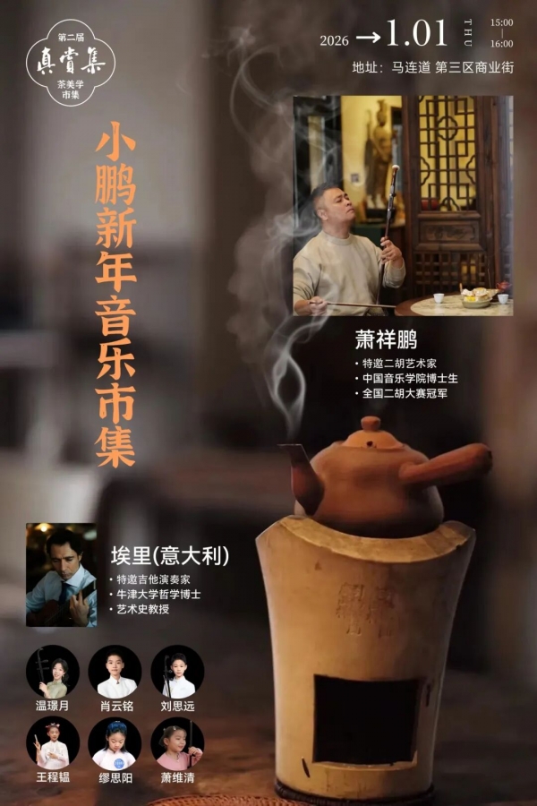 冬日的北京,真赏集第二届茶美学市集如期开幕。作为开场活动,《小鹏新年音乐市集》迅速点燃了现场气氛。中国音乐学院博士生肖祥鹏将其博士课题“音声景观”融入市集实践,强调依据具体生活场景进行音乐与声音的创作设计,并深入挖掘人们对声音的内心感受与理解。
