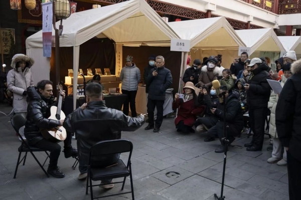 市集筹备于冬季,且为第二届举办,时间较为紧张,初期客流并不密集。然而音乐响起后,逐渐吸引了人群驻足。音乐构建出一个充满意义的现场空间,人们围坐炉边品茶、欣赏古瓷、品闻沉香、聆听讲座。音乐仿佛悄然转变了现场的情绪,为冬日市集注入了温暖与希望。