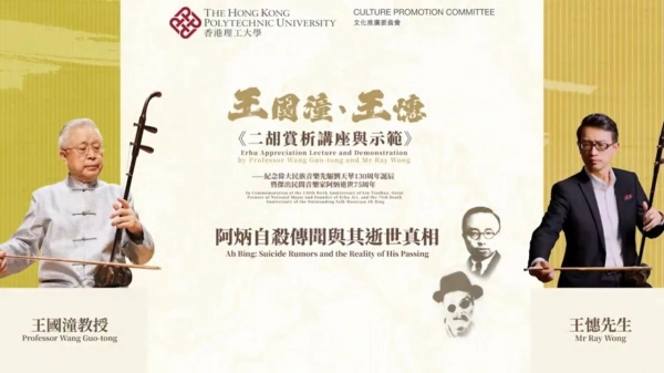 2025年11月15日,香港理工大学于蒋震剧院举办《二胡赏析讲座与示范》,纪念刘天华130周年诞辰及阿炳逝世75周年。国宝级二胡大师、刘天华学派杰出代表王国潼教授主讲。王教授师承刘天华嫡传弟子,开创二胡快弓新时代,被誉为“二胡艺术第三代第一人”。讲座中,王国潼教授梳理了二胡历史,探讨了刘天华、阿炳的贡献及二胡在当代的地位,并由胡琴家王憓现场示范演奏。
