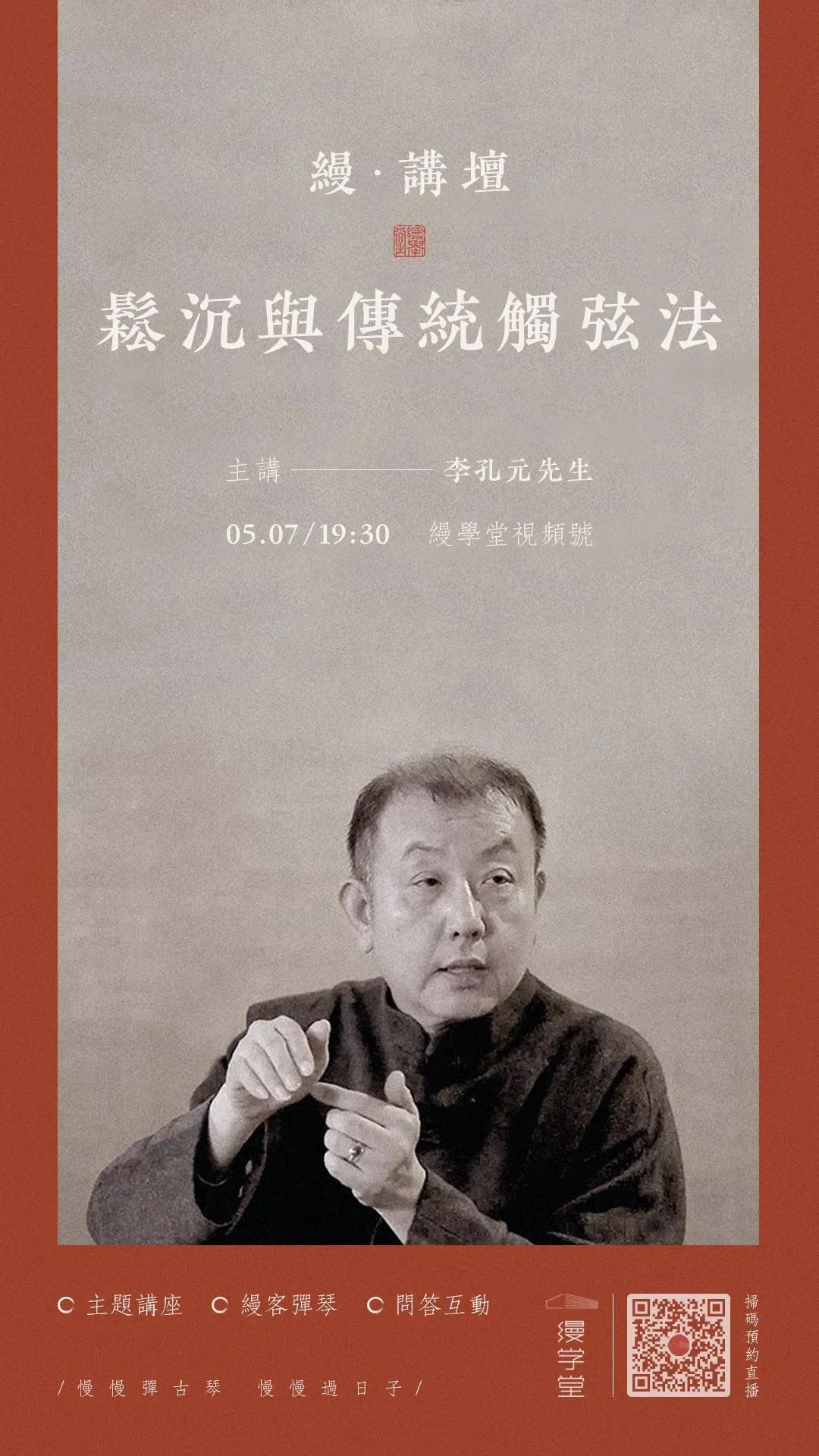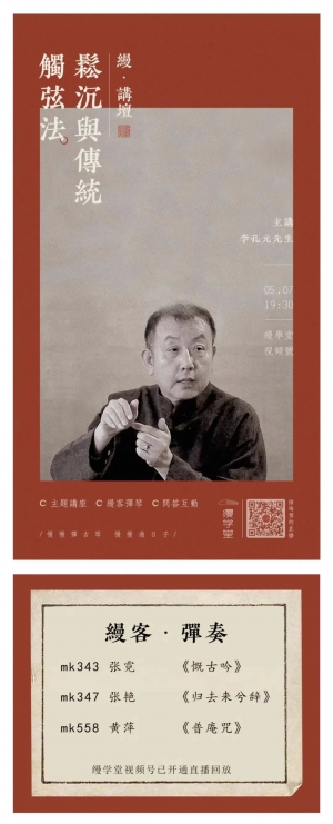 2022年5月7日,缦学堂邀请了当代著名古琴家、台湾大学音乐学研究所副教授、中国琴会名誉理事李孔元先生,将以「松沉与传统触弦法」为题,开设一场缦·讲坛。