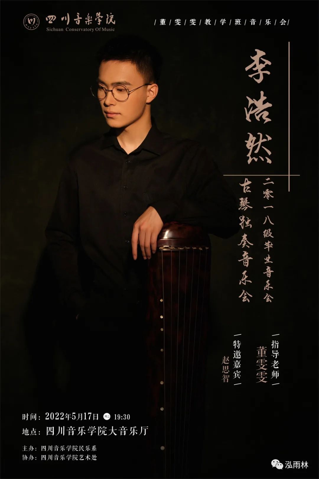 李浩然,2018级民乐系本科学生,以省外第一的成绩考入四川音乐学院。幼承家学,后跟随董雯雯、曾河、李凤云老师学习琴艺。琴风中正安舒、细腻酣畅。善弹曲目《潇湘水云》《梅元吟》《广陵散》等,并创作古琴曲《仙阁云护》。现为山东省聊城古琴代表性传承人、聊城市古琴学会副秘书长,2011参加中韩艺术特长生国际邀请赛获古琴项目儿童组一等奖、2012年第七届世界华人青少年艺术节山东赛区古琴项目儿童组一等奖、2016年参加中韩文化交流汇演,演奏《春风》。2017年获第二届“弘琴杯”少年组银奖,2019年获第三届“弘琴杯”四川赛区金奖,全国总决赛青年组银奖。2020年为抗击疫情创作原创音乐《城》并制作MV,2021年参加“国风新韵”民乐系-电子音乐系音乐会,首演作品《隙》。
