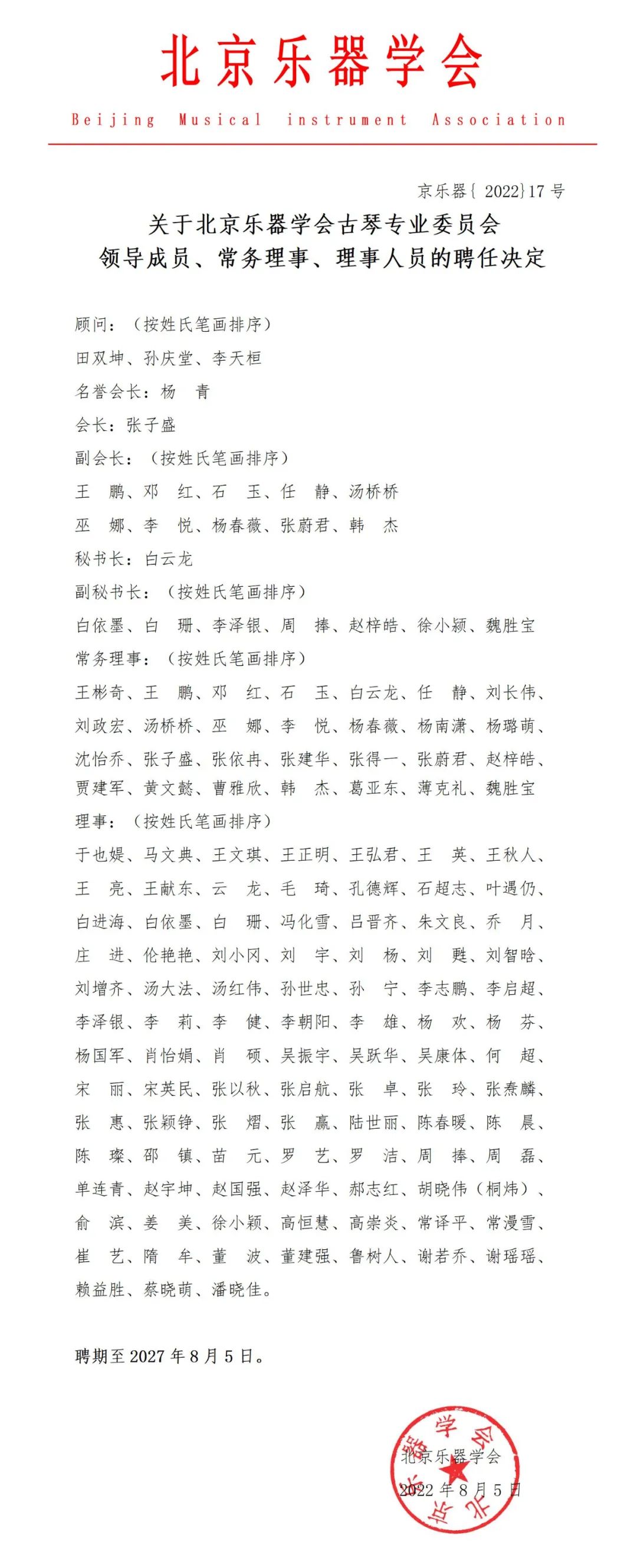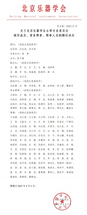 北京乐器学会党建工作小组组长、副会长王家训老师宣读北京乐器学会古琴专业委员会新一届理事会顾问、名誉会长、会长、副会长、秘书长、副秘书长、常务理事、理事成员聘任名单并现场表决通过北京乐器学会古琴专业委员会新一届领导班子、常务理事和理事;聘任张子盛为会长;聘任王鹏、邓红、石玉、任静、汤桥桥、巫娜、李悦、杨春薇、张蔚君、韩杰为北京乐器学会古琴专业委员会新一届副会长;聘任白云龙为北京乐器学会古琴专业委员会新一届秘书长。