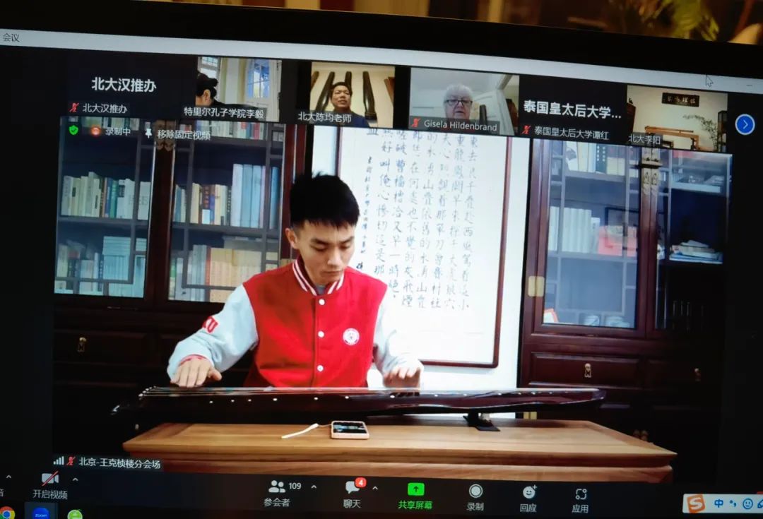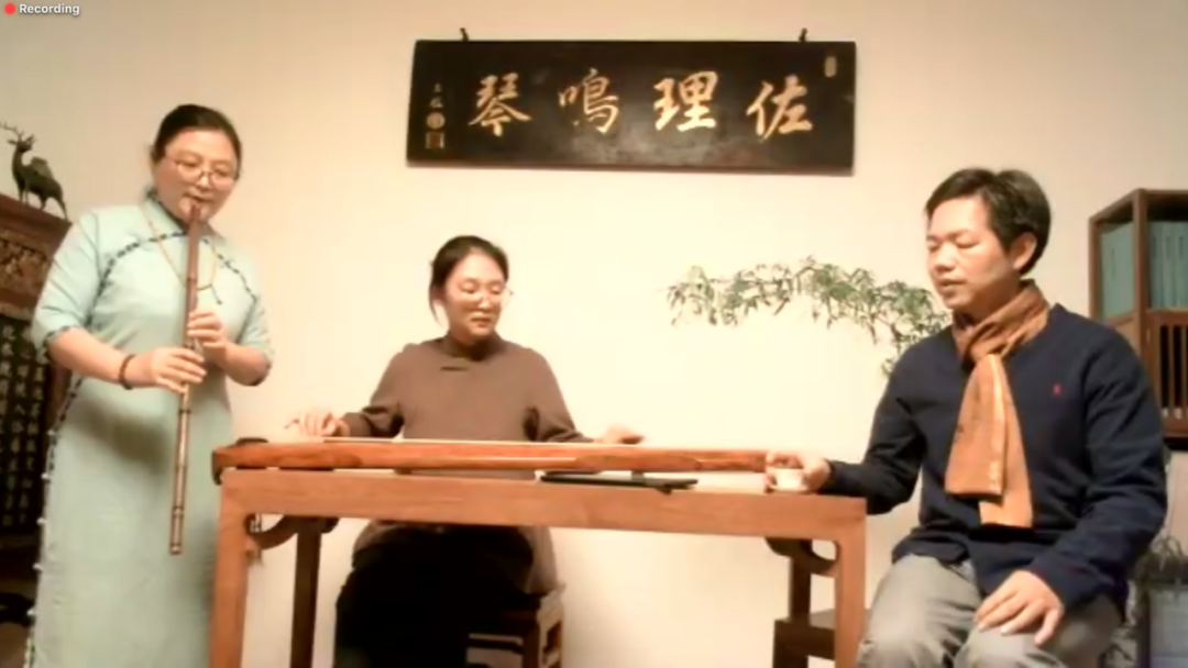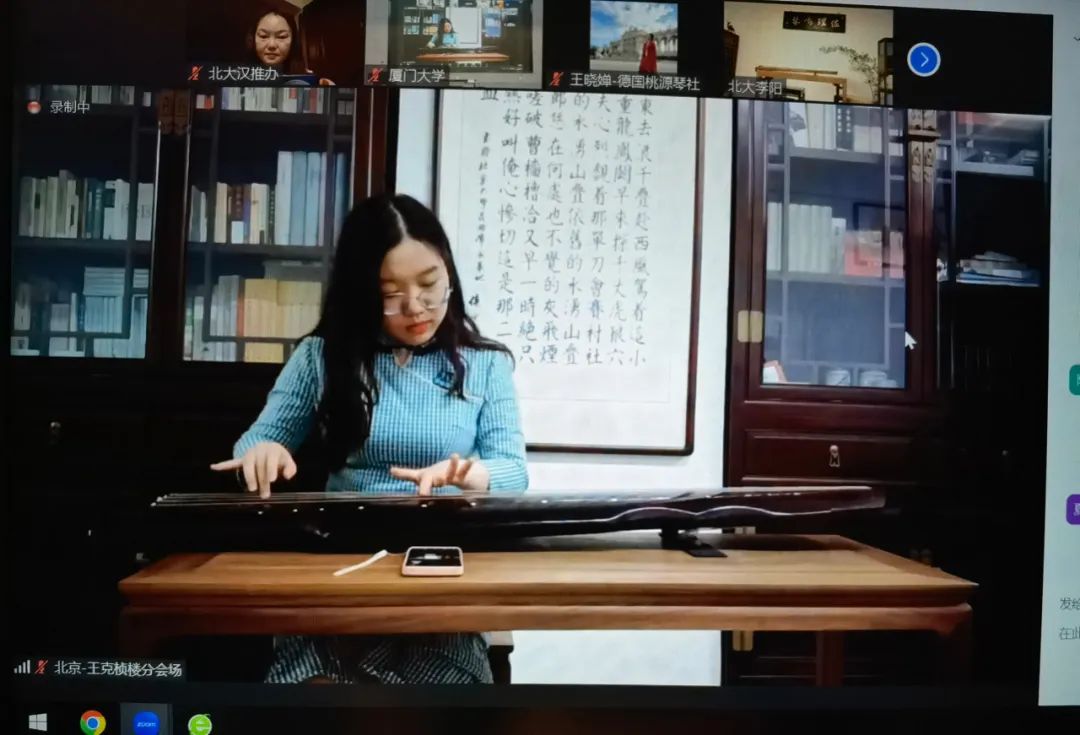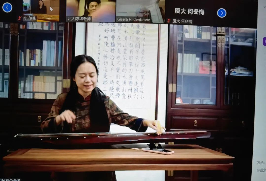学术讨论告一段落后,由北京大学古琴社与德国桃源琴社的老师和社员带来精彩纷呈的表演。曲目包含《阳关三叠》、《离骚》、《神人畅》、《良宵引》、《鸥鹭忘机》等。线上线下会场中,同学们品味音乐,在主持人肖宁遥的引导下猜测曲目名称。