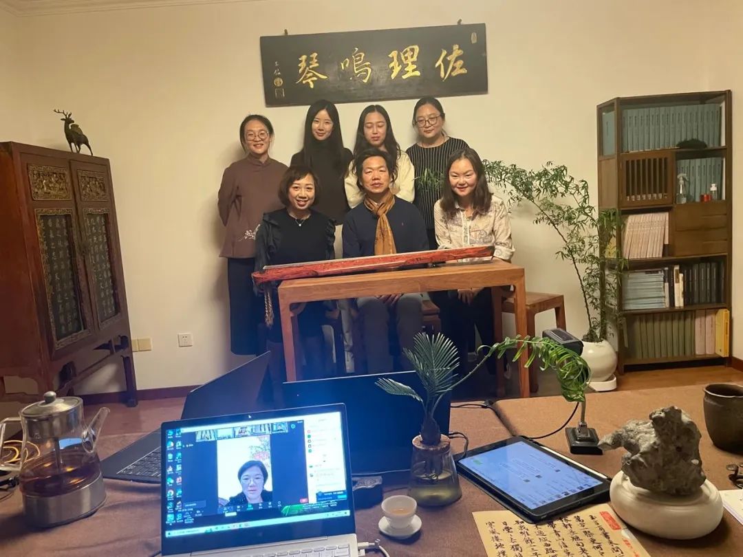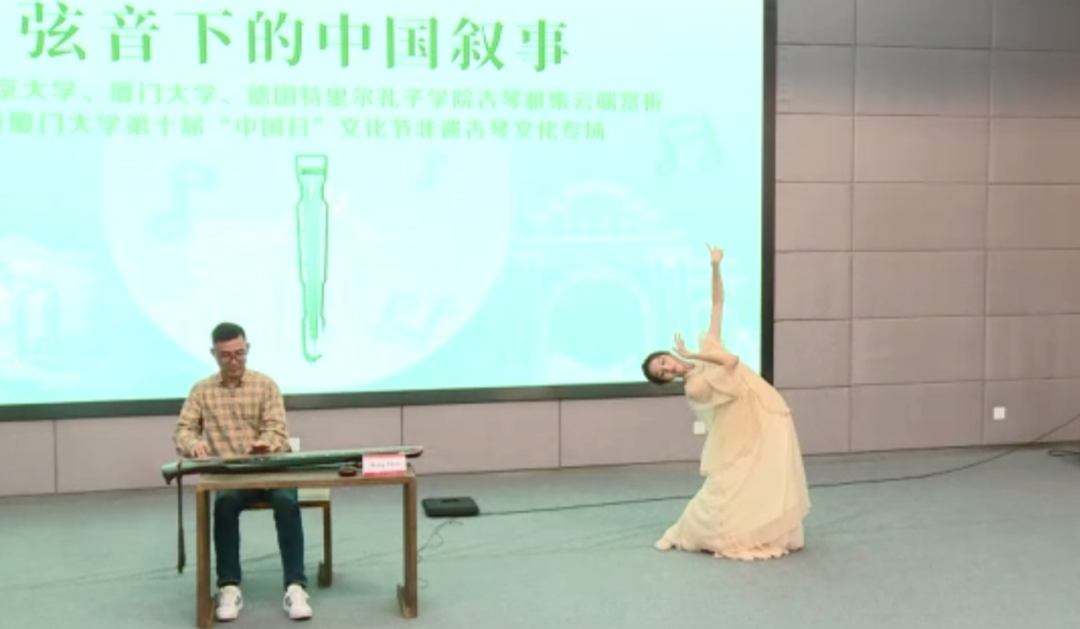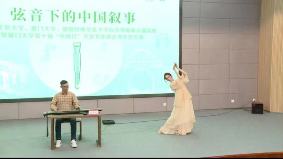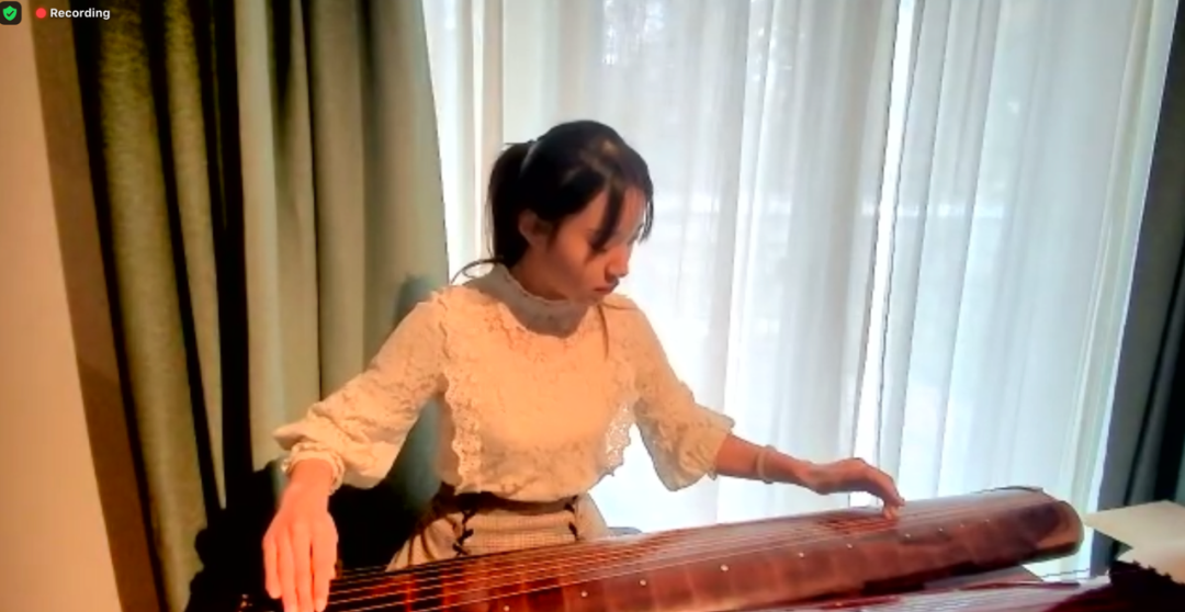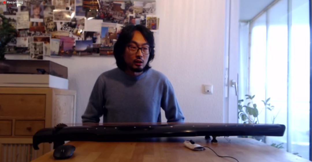 学术讨论告一段落后,由北京大学古琴社与德国桃源琴社的老师和社员带来精彩纷呈的表演。曲目包含《阳关三叠》、《离骚》、《神人畅》、《良宵引》、《鸥鹭忘机》等。线上线下会场中,同学们品味音乐,在主持人肖宁遥的引导下猜测曲目名称。