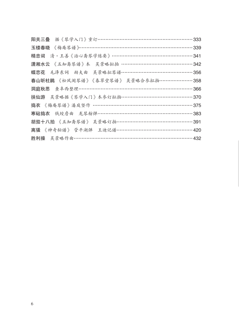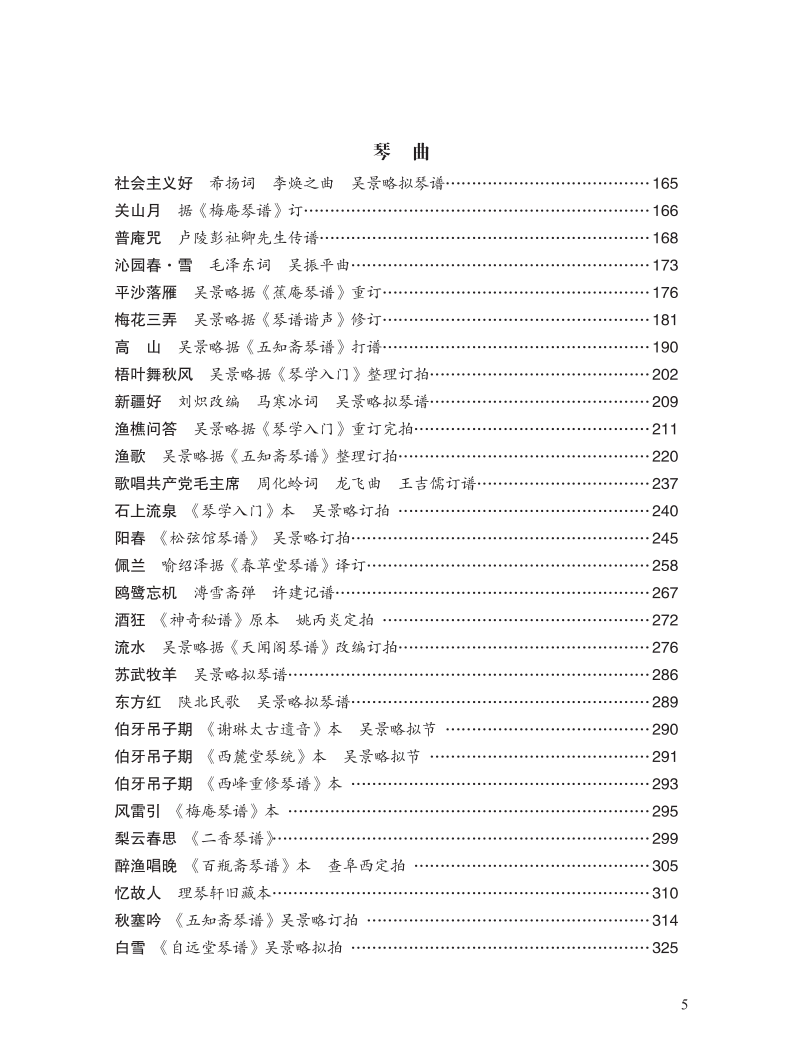 乐曲内容选自各种不同风格的曲操,如川派、熟派、浙派、琅琊、广陵等派兼收并蓄。传统曲目用调性来分类,每调曲目循序排列。此外编入了一些创作改编的新作品,另立新谱曲目一类。