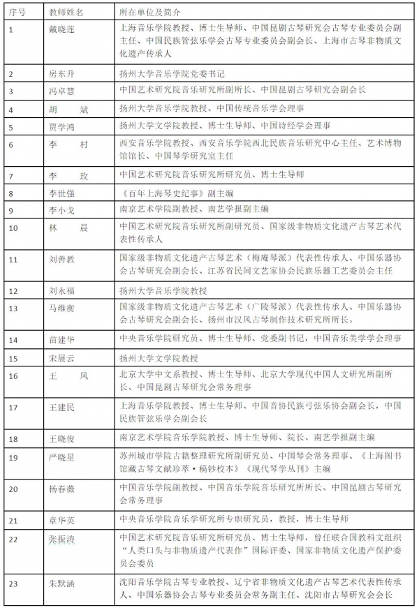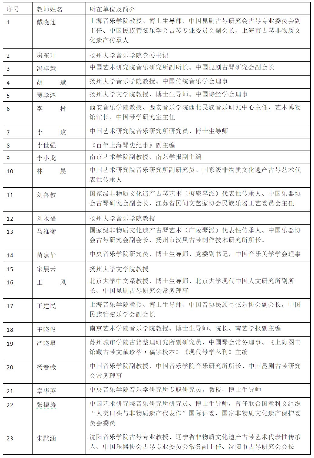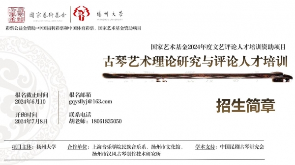 古琴是世界最古老的弹拨乐器之一,更是中国传统文化的经典代表,古琴艺术在中国音乐、社会文化、美学思想等方面具有深刻影响,是中国传统精神文化的代表之一。作为一种文化传承的艺术形式,古琴艺术在现代社会中得到了新的发展。为提升古琴艺术理论研究与评论水平,做好古琴文化传播与传承,受国家艺术基金资助和委托,由扬州大学开展本次《古琴艺术理论研究与评论人才培训》项目。上海音乐学院民族音乐系、扬州市文化馆、扬州市汉风古琴制作技术研究所为本项目合作单位;中国昆剧古琴研究会为本项目提供了重要学术支持。
