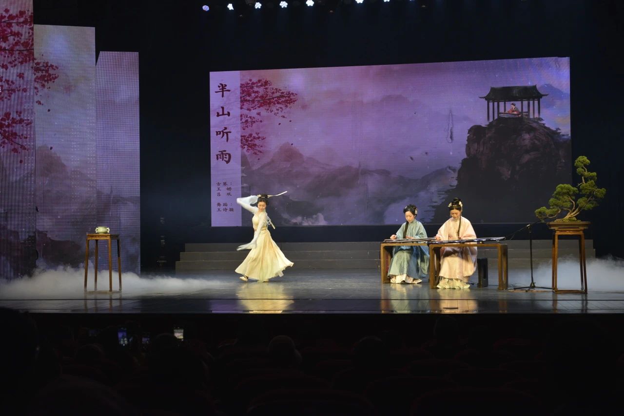 音乐会中,台上的演奏者们琴艺精湛,现场舞台背景古朴典雅,与古琴的雅韵相得益彰。从《四大景》的柳翠花明、春风拂面,到《半山听雨》的音韵如丝,再到《猿鹤双清》《梧叶舞秋风》的意境深远,每首曲子都扣人心弦。