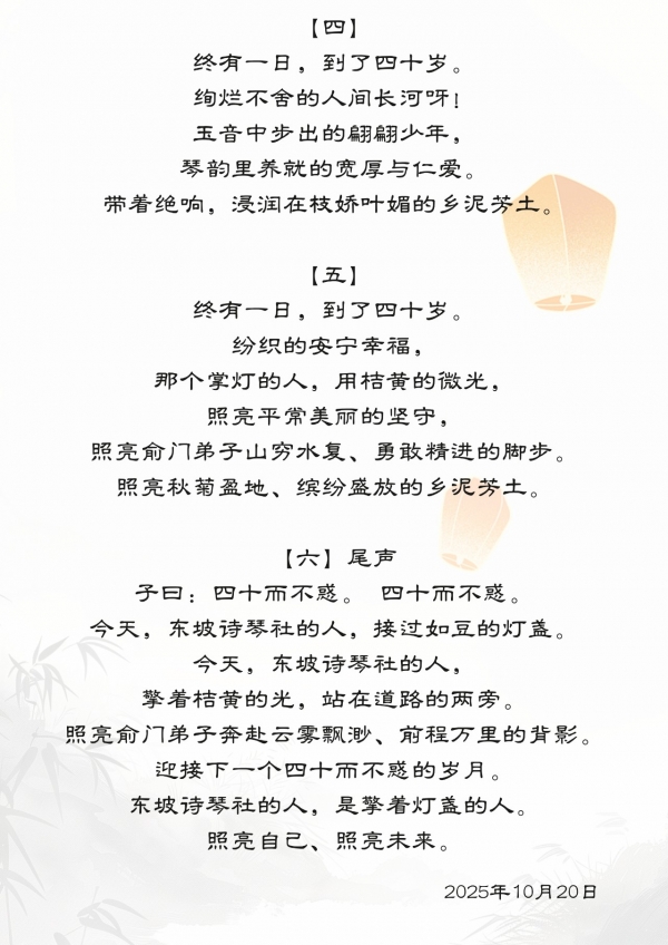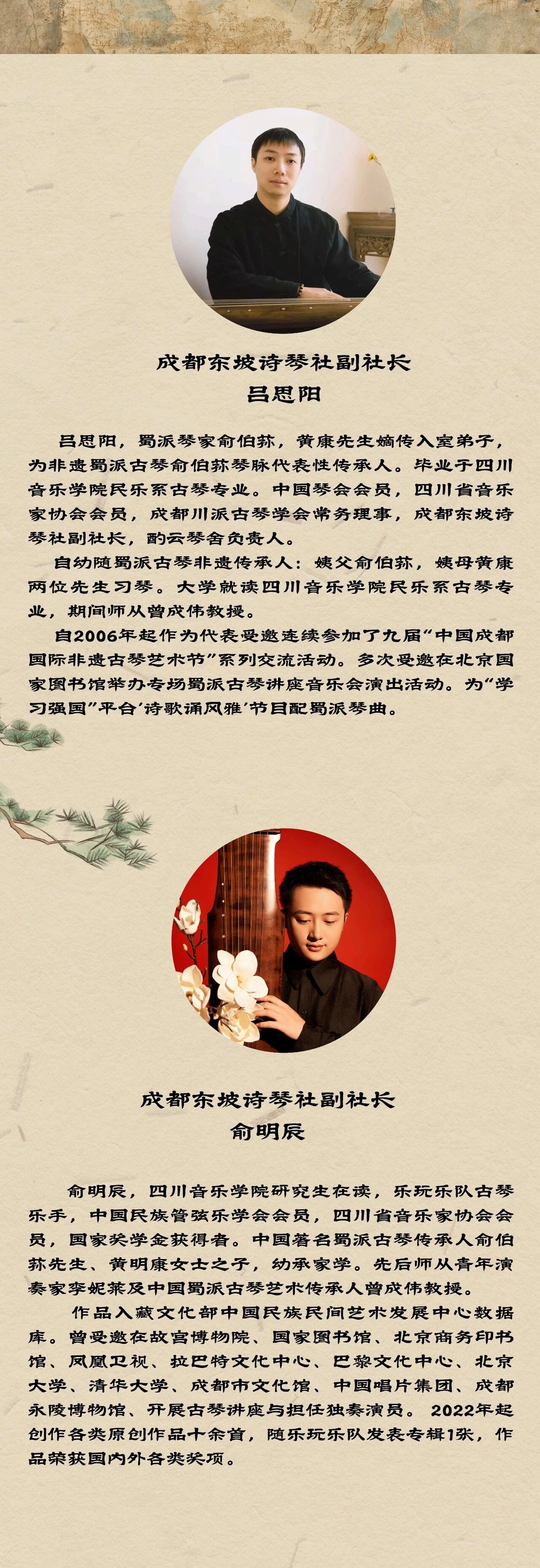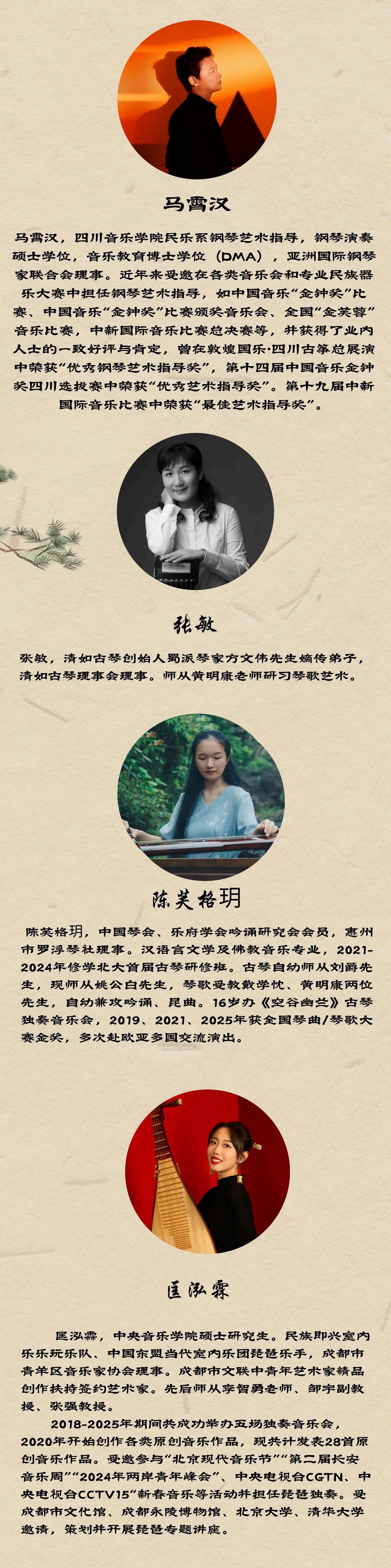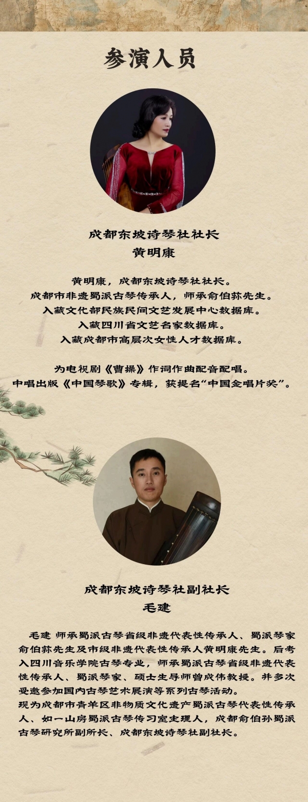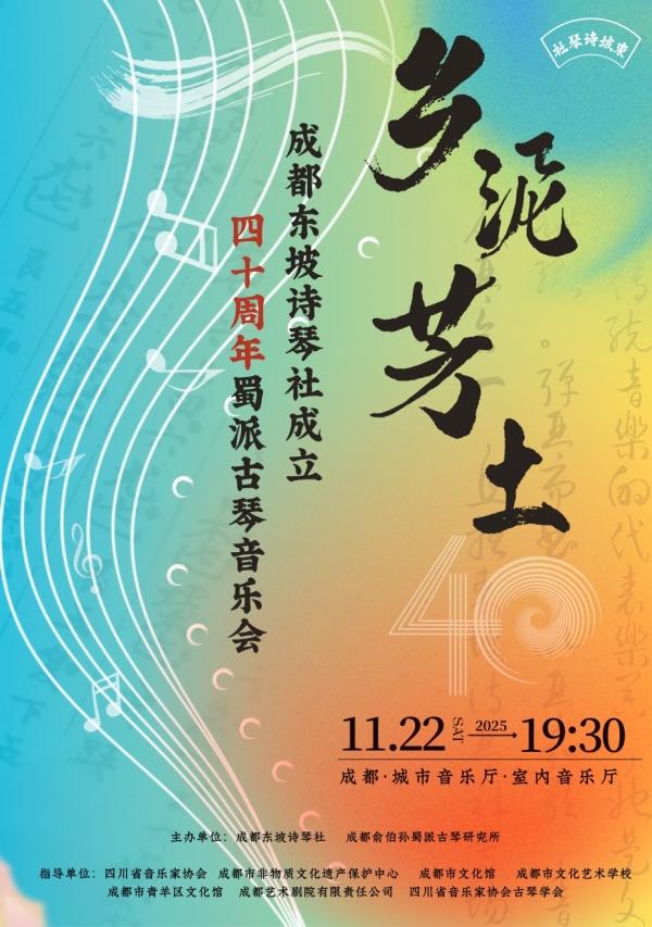 东坡诗琴社自1985年成立迄2025年已历尽40周年。俞伯荪先生创立东坡诗琴社,他是擎着灯盏的人。俞门弟子将继其志,述其事,肩负传承使命,全体东坡诗琴社成员将一齐登台,共同成就蜀派古琴艺术风貌。