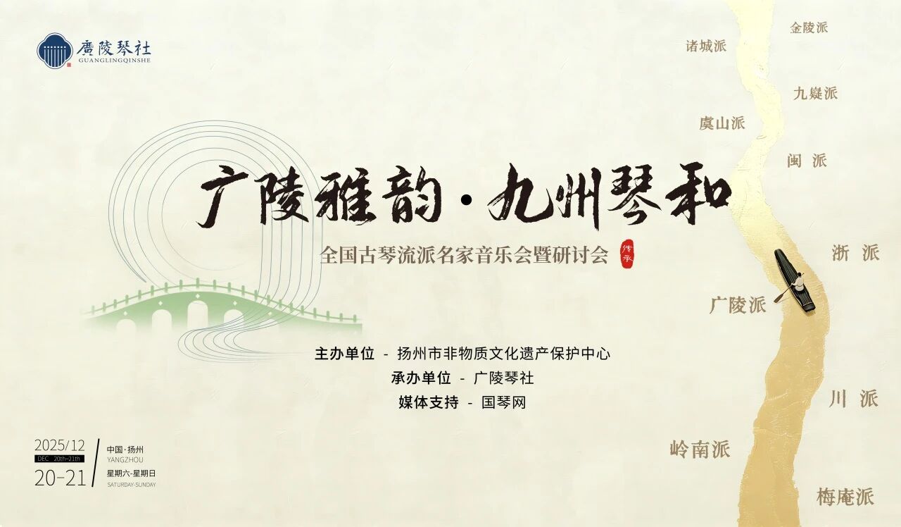 2025年12月20日至21日,由扬州市非物质文化遗产保护中心主办、广陵琴社承办,国琴网协办的大型古琴活动 “广陵雅韵・九州琴和”—— 全国古琴流派名家音乐会暨研讨会在扬州隆重举行。