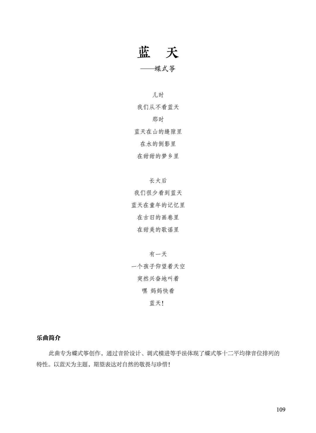 该集收录七部独奏作品均为祁瑶教授及其指导的古筝专业学生所创作,并附演奏示范音频。《作品选Ⅱ》(此处简称)延续了《作品选Ⅰ》的原创性,而又带动起一批尝试筝曲创作的古筝演奏专业学生。如果说练习曲与视奏教材属古筝演奏技术范畴,《作品选Ⅰ》则是她在古筝教学中对“演”(演奏)、“创”(创作)、“研”(研究)能力的高度重视和对学生有意识地引导的呈示部,而《作品选Ⅱ》是她对学生深层艺术感知能力与智慧引导的展开部。