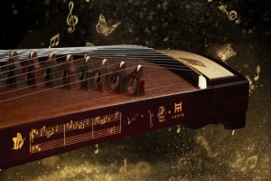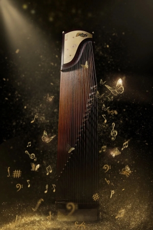 该款古筝将上海博物馆馆藏画作复刻于花板之上,两只蝴蝶翩翩起舞,形影相随,表达了对爱情的美好祝福。古筝侧板选用金粉描绘何占豪先生的《梁山伯与祝英台》曲谱手稿,并附有何占豪先生的亲笔签名,极具纪念意义和收藏价值。