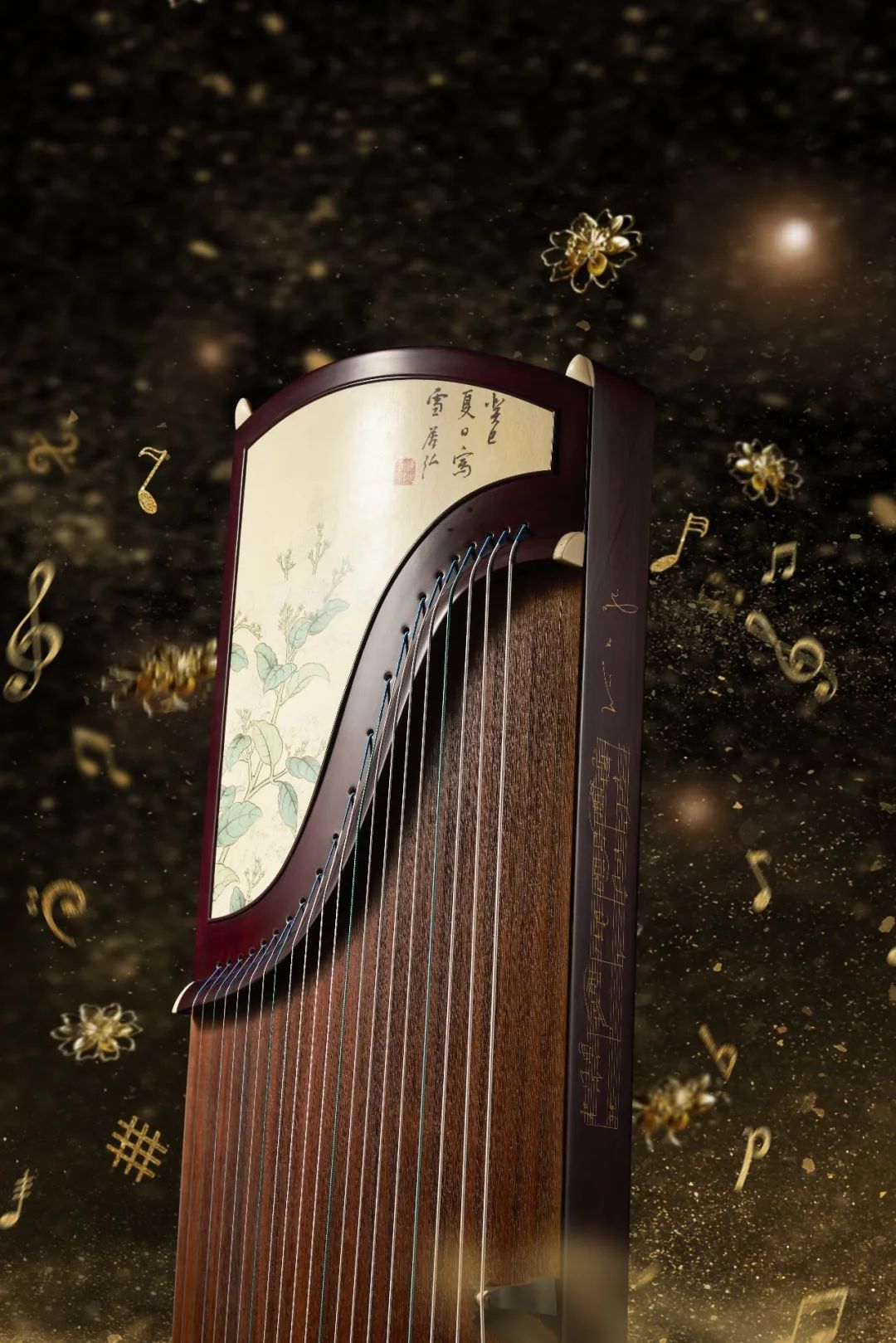 在设计上,运用上海市非物质文化遗产项目——珂罗版书画复制技艺,分别展示了何占豪先生所创作的著名乐曲《梁山伯与祝英台》《茉莉芬芳》中梁祝化蝶的唯美爱情故事以及茉莉花秀丽淡雅的绰约风姿,赋予了古筝生动的艺术表现力。