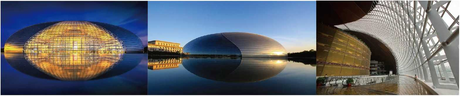 国家大剧院造型独特的主体结构,一池清澈见底的湖水,以及外围大面积的绿地、树木和花卉,体现了人与人、人与艺术、人与自然和谐共融、相得益彰的理念。