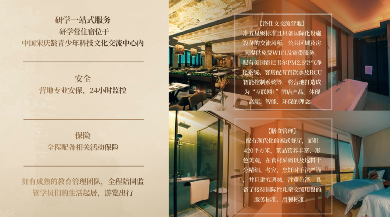 研学营住宿位于中国宋庆龄青少年科技文化交流中心内。拥有成熟的教育管理团队,全程陪同监管学员们的生活起居,游览出行安全,营地设有专业安保、24小时监控,并全程配备相关活动保险。
