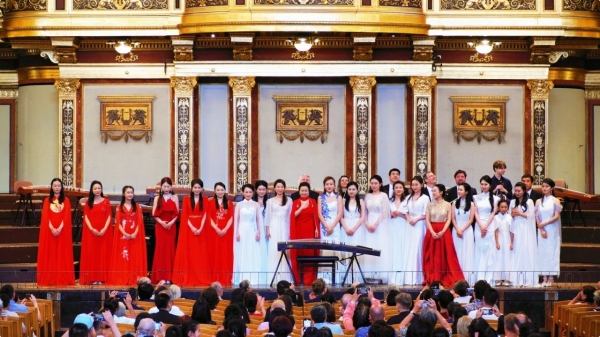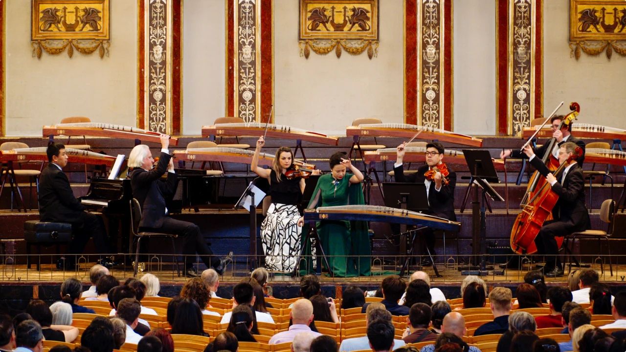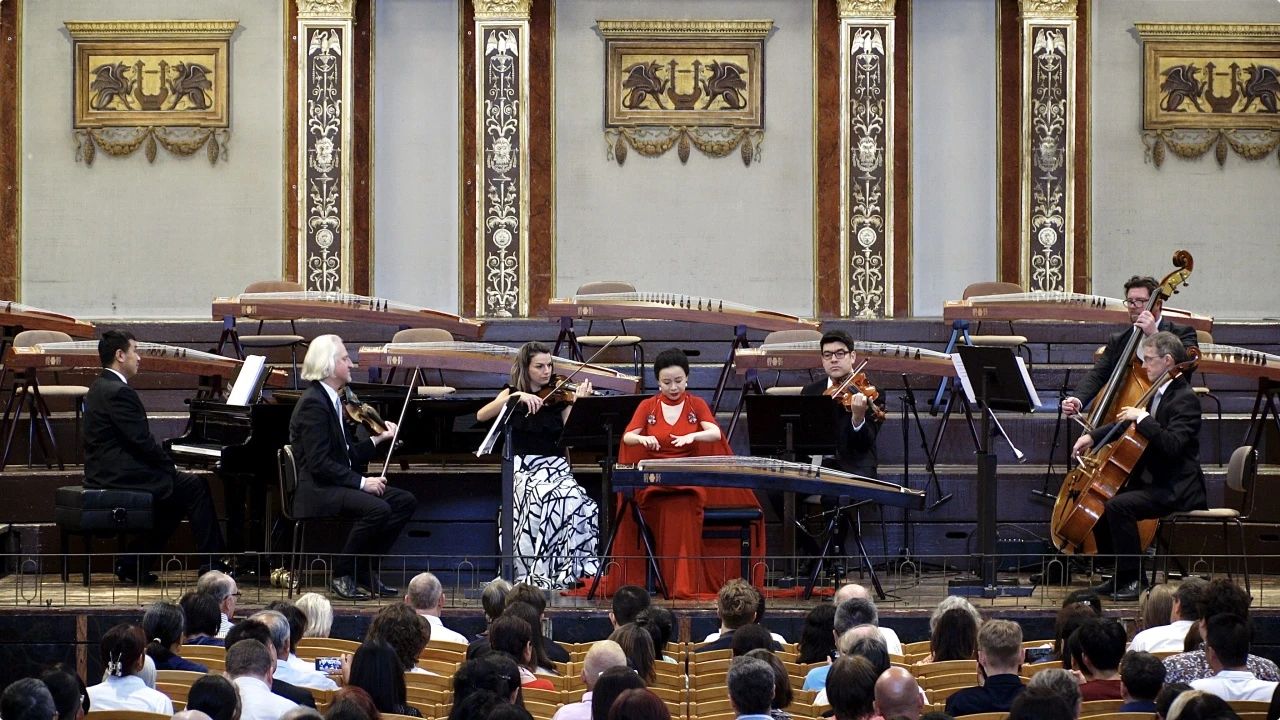 伴随着热烈的掌声,陆晶教授及参演人员在最后也为大家带来了一首被誉为奥地利第二首国歌的返场曲目《雪绒花》。至此,“国乐传承——维也纳金色大厅陆晶古筝专场音乐会”取得了圆满成功,向世界人民弘扬中国传统音乐。感谢陆晶教授的精彩演出,让中国民族音乐绕梁于维也纳金色大厅。同时感谢《云裳诉》作曲家周煜国教授、《梁祝》作曲家何占豪教授为本次音乐会精心编配的弦乐五重奏版本。祝贺陆晶教授演出圆满成功!