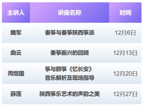 近年来,陕西省秦筝学会以推广民族音乐,传承秦筝艺术为宗旨举办了多场音乐会及筝艺名家系列讲座,线上线下累计参与人次超过百余万人次,受到广大筝乐爱好者的欢迎。本次秦筝艺术季期间,学会将邀请魏军、曲云、薛莲三位秦筝代表人、著名作曲家周煜国先生,围绕秦筝的历史传承、技术特点、演奏、创作等为主题,采用“讲”“演”结合的形式,让秦筝艺术走近广大群众。