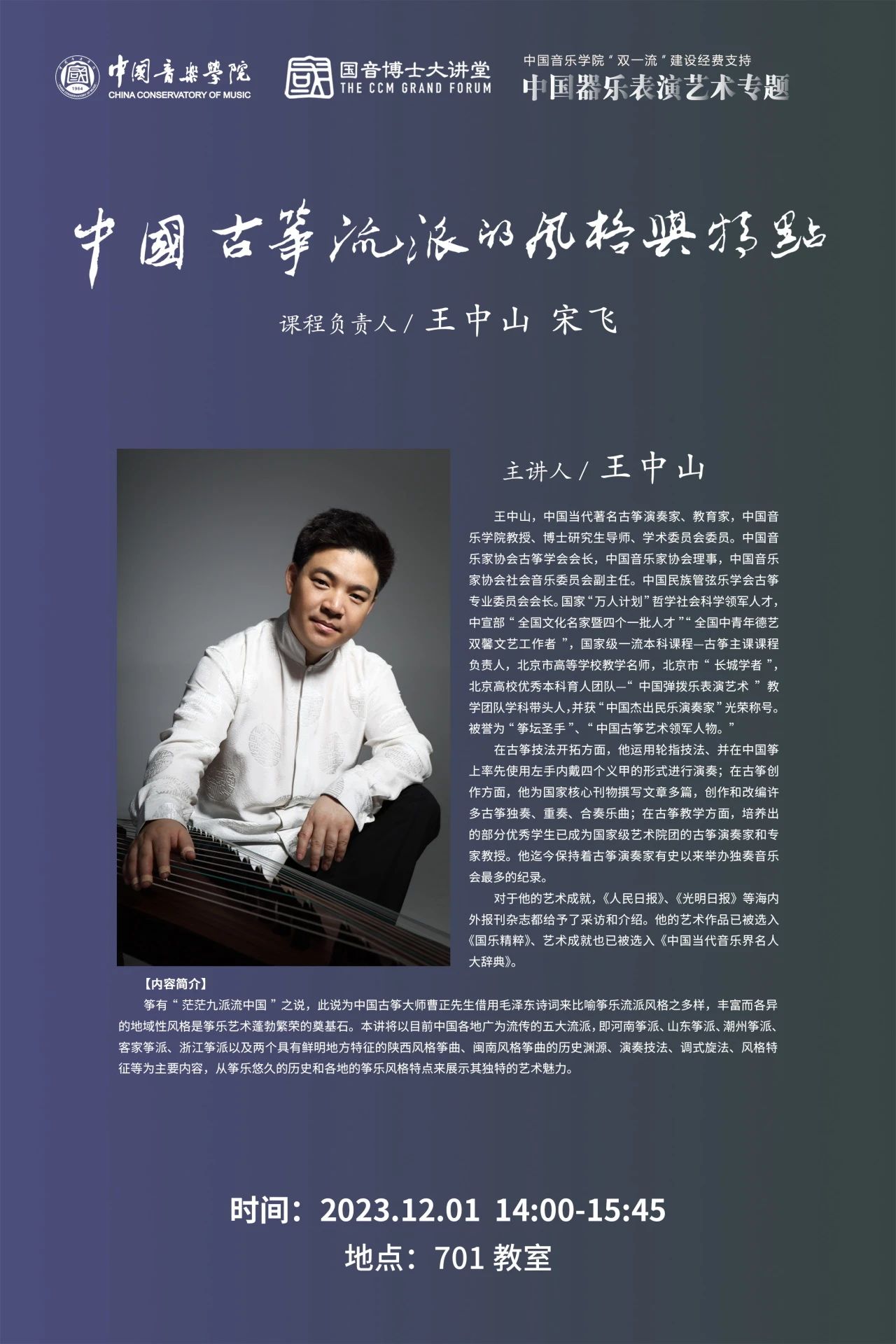 王中山,中国当代著名古筝演奏家、教育家,中国音乐学院教授、博士研究生导师、学术委员会委员。中国音乐家协会古筝学会会长,中国音乐家协会理事,中国音乐家协会社会音乐委员会副主任。中国民族管弦乐学会古筝专业委员会会长。国家“万人计划”哲学社会科学领军人才,中宣部“全国文化名家暨四个一批人才”“全国中青年德艺双馨文艺工作者”,国家级一流本科课程—古筝主课课程负责人,北京市高等学校教学名师,北京市“长城学者”,北京高校优秀本科育人团队—“中国弹拨乐表演艺术”教学团队学科带头人,并获“中国杰出民乐演奏家”光荣称号。被誉为“筝坛圣手”、“中国古筝艺术领军人物。”