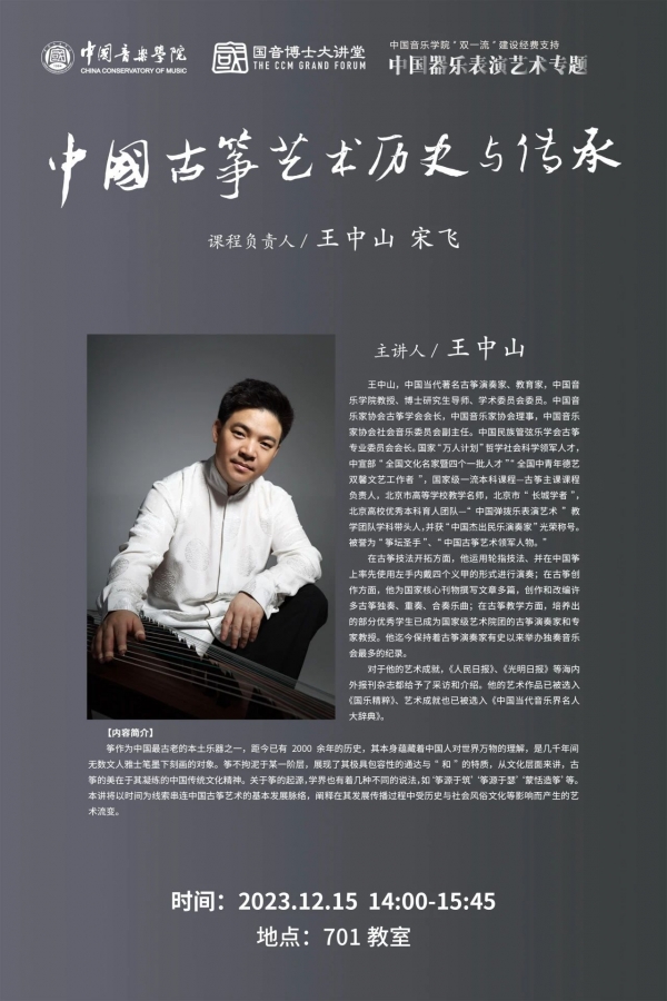 《中国器乐表演艺术专题》是中国音乐学院 “国音博士大讲堂”学术品牌课程之一,是研究生院联合国乐系开设的音乐实践类课程。本课程集中国器乐表演美学、理论研究、创作实践、评论品鉴为一体,以中国器乐历史发展、风格特色、二度创作实践创新、理论发展探索为核心板块,汇聚国内顶级演奏家、作曲家和专家学者构成导师团队,对中国器乐的风格、流派等方面以及音乐语言特征、审美特质等多个维度展开研讨式教学,采用课堂教学与舞台实践为一体的创新培养模式和“讲座、研讨、工作坊”的形式,构建学生对中国器乐表演艺术的历史观、全局观、时空观、审美观、发展观等思维建设和深层理解。通过聚焦弹拨乐和弓弦乐的系统性研究,本课程将辐射中国器乐表演艺术的各个领域,并带动中国器乐表演艺术的全面传承与创新发展,成为培养中国器乐表演、创作和研究领域的复合型高级人才的孵化平台和可持续的课程体系。