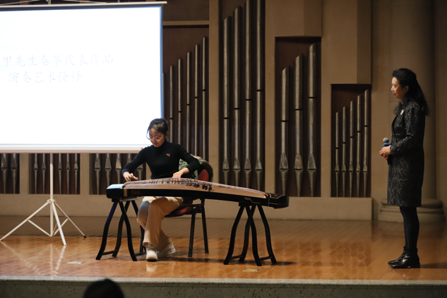 接下来,中央音乐学院周望教授带来了本次活动的第五场讲座《周延甲先生秦筝代表作品演奏艺术诠释》。周望教授讲述了秦筝的溯源、发展与继承,以及陕西流派筝曲的演奏特点,强调了大指按弦、托劈和夹弹技法的重要性以及陕西筝曲语气感的把握。讲座通过弹奏加讲解的方式,让我们更加清晰地了解陕西流派筝曲在实际演奏中应把握的核心要义。最后,周望教授为我们弹奏了周延甲先生的代表筝曲《凄凉曲》、《道情》,引发现场所有师生的强烈共鸣和热烈掌声。