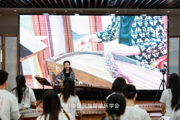 在第二天的研修中,周望教授为大家精讲了经典秦筝流派曲目《秦桑曲》,解析曲目的技法要领。助教周本立老师带领大家进行精练,并详细讲解了《秦土情》,与大家共同领略了秦筝的深厚情感表达。