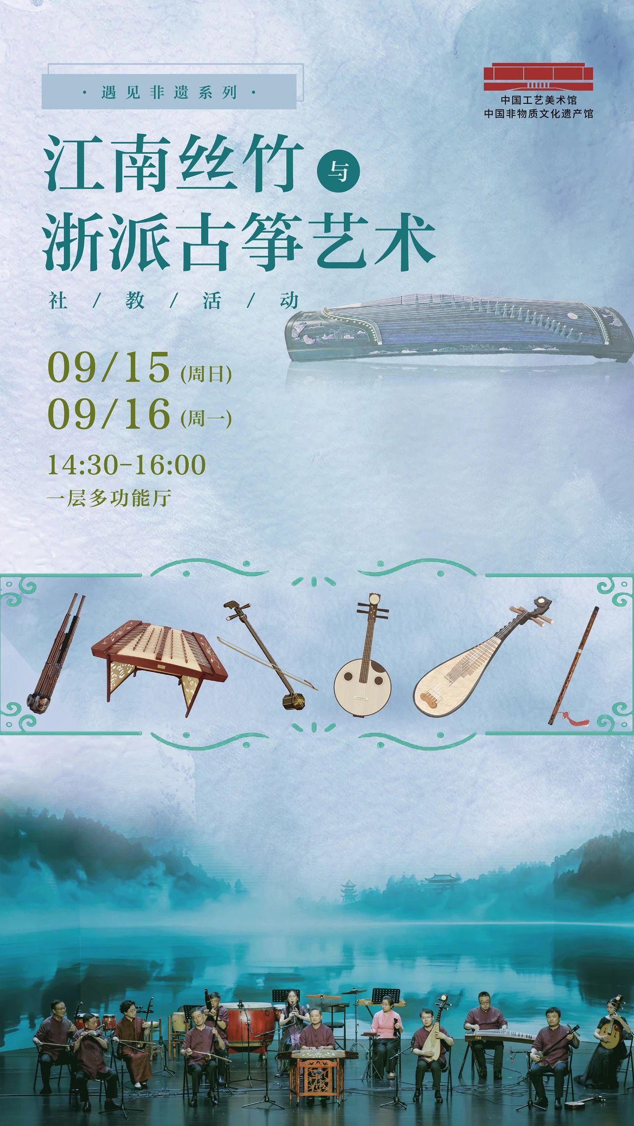 时值中秋佳节,我馆将于9月15—16日下午14:30—16:00,推出“遇见非遗”——江南丝竹与浙派古筝艺术社教活动,带来《中花六板》《高山流水》《春莺啭》等多首江南丝竹和浙派古筝艺术名曲。以期让观众在阵阵秋意里,静心聆赏,寻觅丝竹声中的清雅江南。