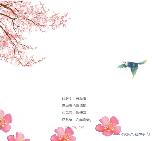 这是南宋诗人陆游写给前妻唐婉的诗,字字句句感受到往昔的美好回忆,也体会到陆游与唐婉现实的无奈与分离的苦楚。