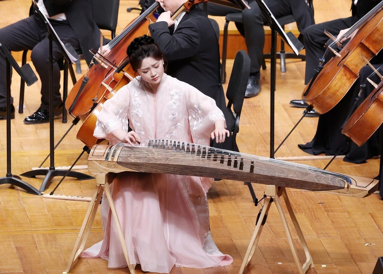 身着飘逸礼服的王钰,在观众们热烈的掌声中稳步登台。她以创作与演奏的双重身份,以丝弦为媒,为观众细腻地诠释了“归雁传情、丝弦和鸣”的深层意蕴。她对《归雁书》这首作品的演绎打破了独奏时的 “气场主导”,指尖力度收放自如,与板胡时而高亢,时而吟唱的起伏旋律丝弦和鸣。胡瑜教授在演奏中以细腻音色呼应,开篇处用近似陕北民歌的旋律起 “问”,如归雁长鸣;王钰的古筝随即以连绵滑音作 “答”,似家书絮语。中段旋律交织时,板胡的刚劲被古筝的柔润包裹,古筝的婉转因板胡的豪迈更显层次,恰如归雁掠山川的 “一呼一应”。王钰将创作理解融入演奏,肢体语言舒展不张扬,赋予了古筝深沉内敛又不失艺术张力的气质与气魄。音乐结构层层递进、跌宕起伏,行至尾声处,板胡、古筝与交响乐队的旋律交织碰撞,瞬间将乐曲推向辽阔释然的强音高潮,全场随即爆发出热烈的掌声。