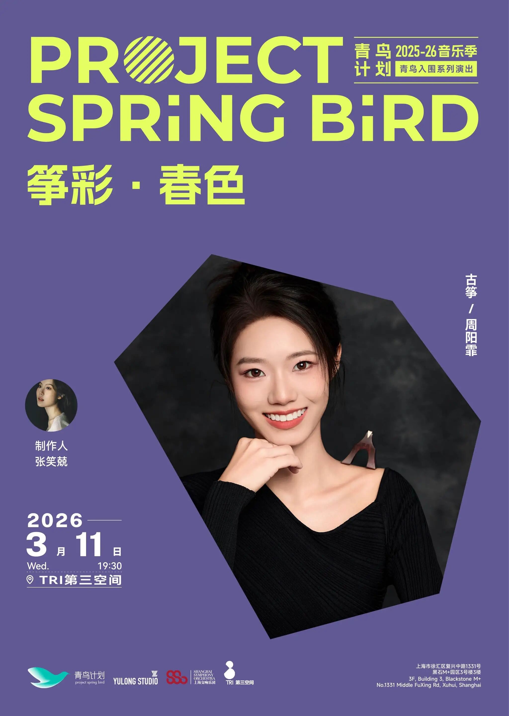 本场演出由青鸟计划成员、古筝演奏家周阳霏领衔,以古筝为核心,融汇传统精髓与现代创新,串联起传统与现代的音乐对话:从河南筝曲代表作《汉江韵》的粗犷明快,到浸润江南风情的《姑苏城》,再到首演作品《姑娘插秧在云间》的田园意趣,曲目横跨多地域风格。