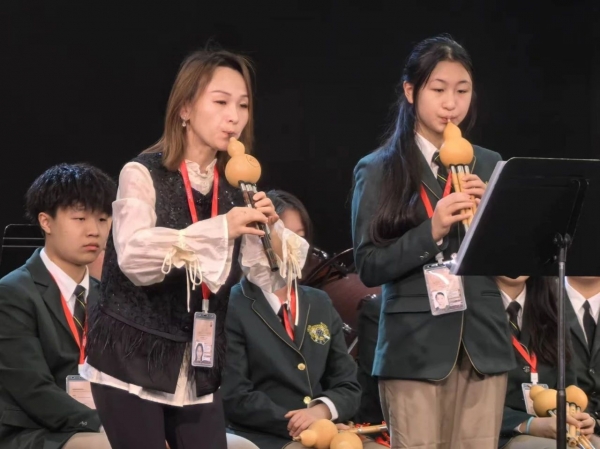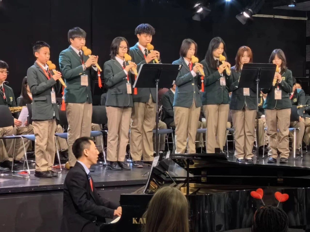 图为2019年2月韩莎莎老师第一次带乐团学生,将葫芦丝奏响金色大厅