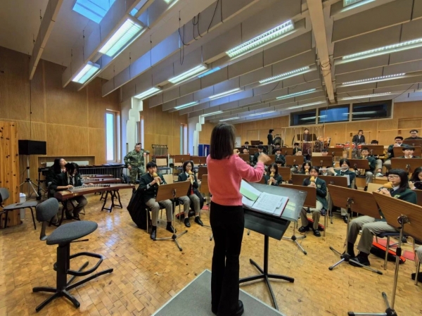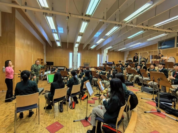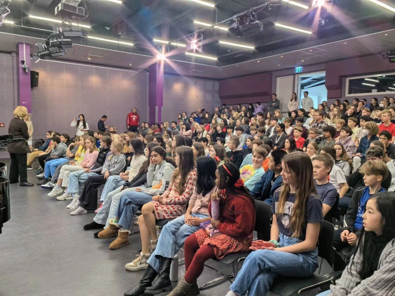 乐团学生在韩莎莎老师的带领下,与维也纳美国国际学校进行校际交流,现场气氛热烈,中外学生们不仅交流了音乐知识,也增进了友谊,促进国际团结。