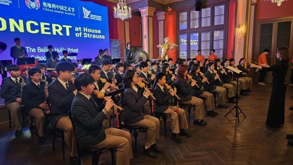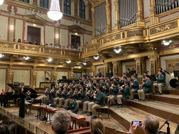 2月18日,赢下赛事金奖后,器乐艺术团在维也纳金色大厅参加音乐盛典演出,奏响原创乐曲《欢庆》、《汇佳进行曲》。