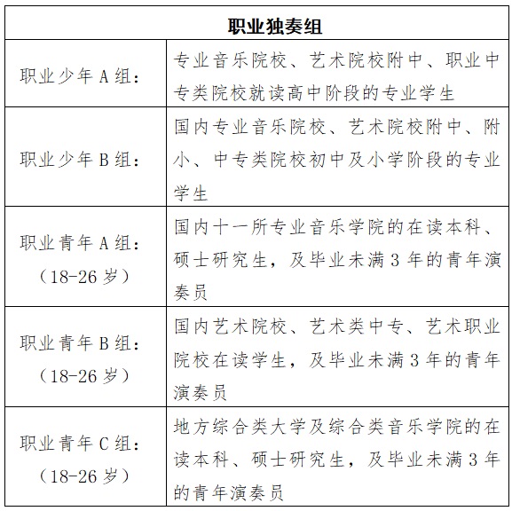 职业组:面向专业音乐院校、艺术院校附中、音乐学院等艺术类专业在读学生及毕业生,不得兼报非职业组。
