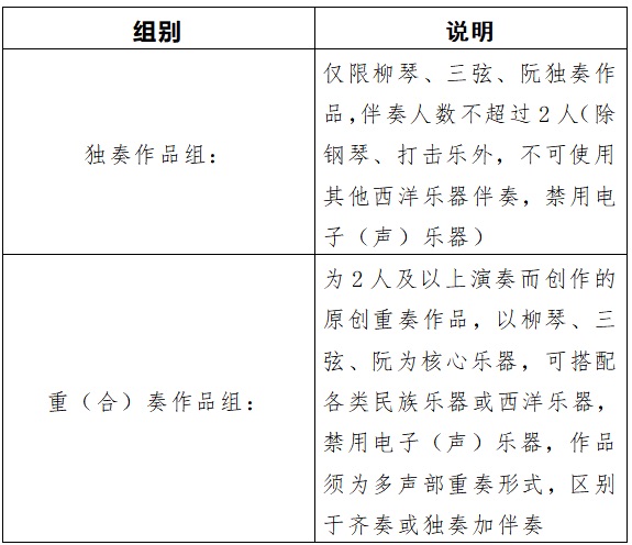 以线上报送作品的形式开展,仅限柳琴、三弦、阮相关原创作品,分为独奏作品、重(合)奏作品两类,适配本次展演专业设置要求。
