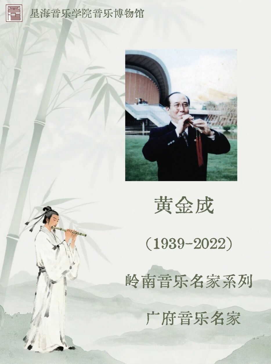 黄金成(1939-2022),1939年11月生于佛山市南海,系中国音乐家协会会员、星海音乐学院教授、著名民族管乐演奏家,曾获第三届羊城音乐花会器乐独奏比赛优秀奖,也是中国首届广东音乐邀请赛一等奖获得者。先生早年就读佛山市第一中学时就喜爱音乐,特别是喜爱吹奏乐器,后曾加入佛山市第一中学的西洋乐队,吹长笛并且兼任指挥。1958年,佛山成立文工团,佛山市委出调令将正在读高三的黄金成先生调到文工团。后来,先生就留在佛山市文工团工作。广州音乐专科学校招考时,黄金成先生被破格录取。第一年师从朱海学高胡,第二年便改学笛子。从此民族管乐便伴随黄金成先生的一生。学习期间,黄金成先生曾赴天津音乐学院学习,拜会了陆春龄等老前辈,并跟杨立中学习。三个月的学习中,黄金成先生掌握了北方梆笛的演奏技巧,这为他今后钻研和演奏北方风格的乐曲打下良好的基础。天津回来后,黄金成先生便代表广州音乐专科学校参加了第一届羊城音乐花会开幕式演出。1962年,在广州音乐专科学校毕业后留校任教,师承梁秋、冯子存、黄锦培、朱海、杨立忠等名家。正因黄金成先生基础扎实、技巧娴熟,不仅深谙笛子、洞箫的演奏,而且还擅长口笛、陶埙的演奏和制造。