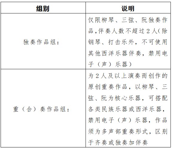 以线上报送作品的形式开展,仅限柳琴、三弦、阮相关原创作品,分为独奏作品、重(合)奏作品两类,适配本次展演专业设置要求。