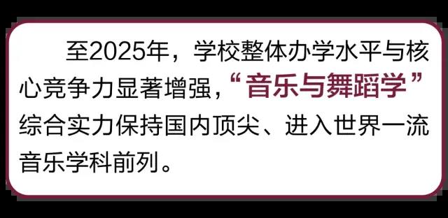 作为首批“双一流”建设高校之一,学校充分认识到肩负高等教育与文艺工作的时代重任。坚持以“文教结合”双轮驱动不断探索世界音乐的发展前沿、弘扬中华民族传统优秀文化、繁荣社会主义先进文化提升公民美育、传播当代中国价值观念。深入推进“双一流”建设,培养一流人才、服务国家战略、争创世界一流,通过首期建设取得了质的提升与跨越式的发展。