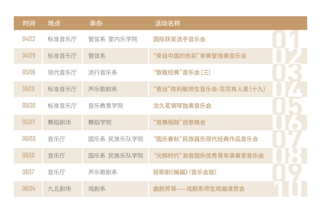 “相约浙音”周末音乐会是浙江音乐学院倾力打造的惠民文化品牌,也是学院进一步发挥学科、专业和人才优势,完善学生艺术实践的一项长效机制和举措。建校以来,浙音始终将教学与艺术实践有机结合,“以演代练”,在提升学生演奏水平和综合能力的同时,形成了一大批高水平的音乐作品,实现了“周周有演出、年年有精品”的优质艺术资源矩阵。
