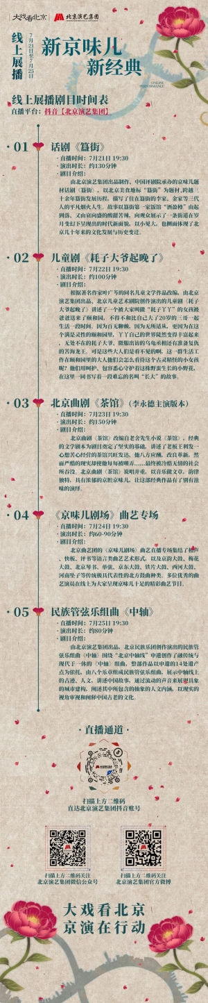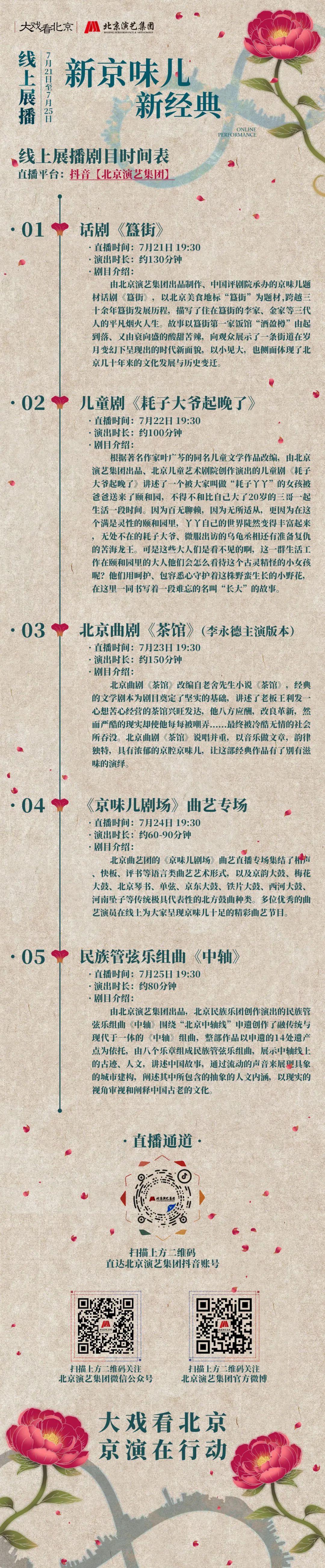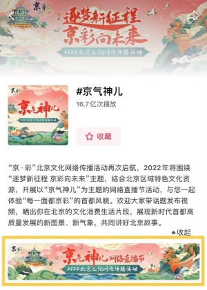 本次线上展播中,话剧《簋街》、儿童剧《耗子大爷起晚了》、民族管弦乐组曲《中轴》、《京味儿剧场》曲艺专场的线上直播纳入到由市委宣传部指导、市委网信办主办的2022年“京·彩”北京文化网络传播活动“京气神儿”网络直播节之“京彩好戏”直播周。