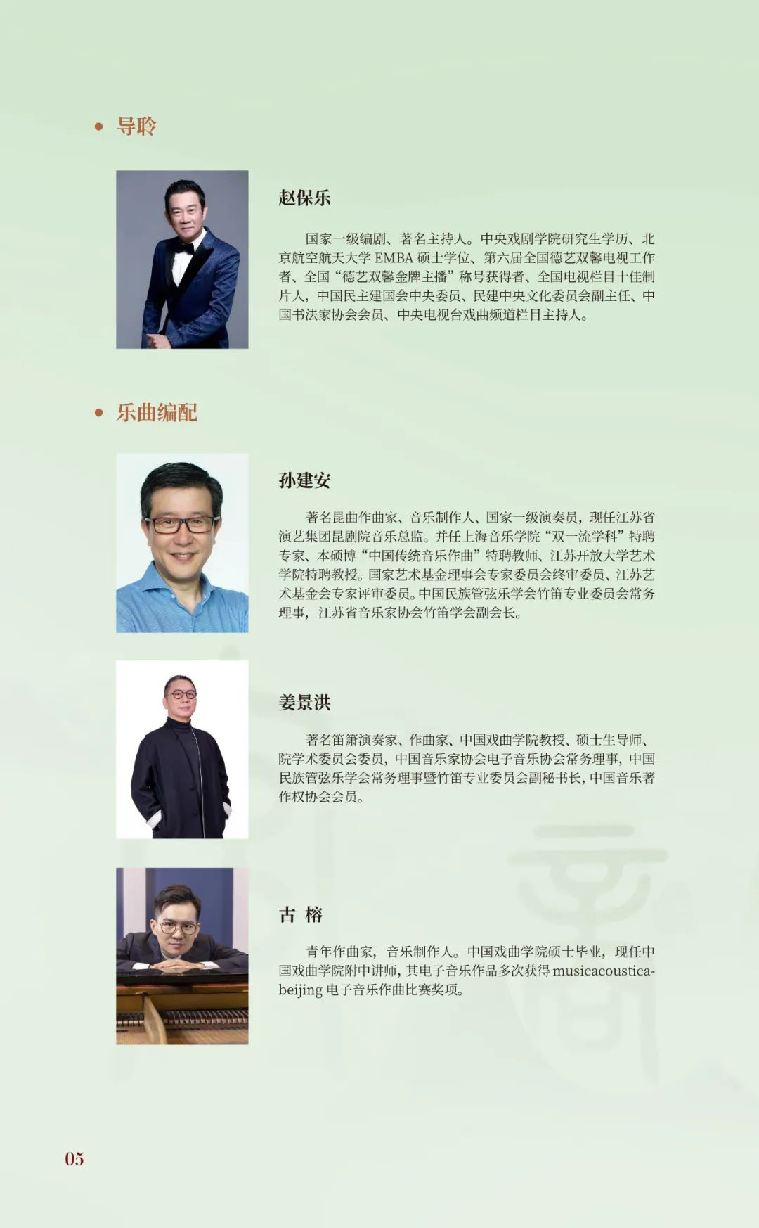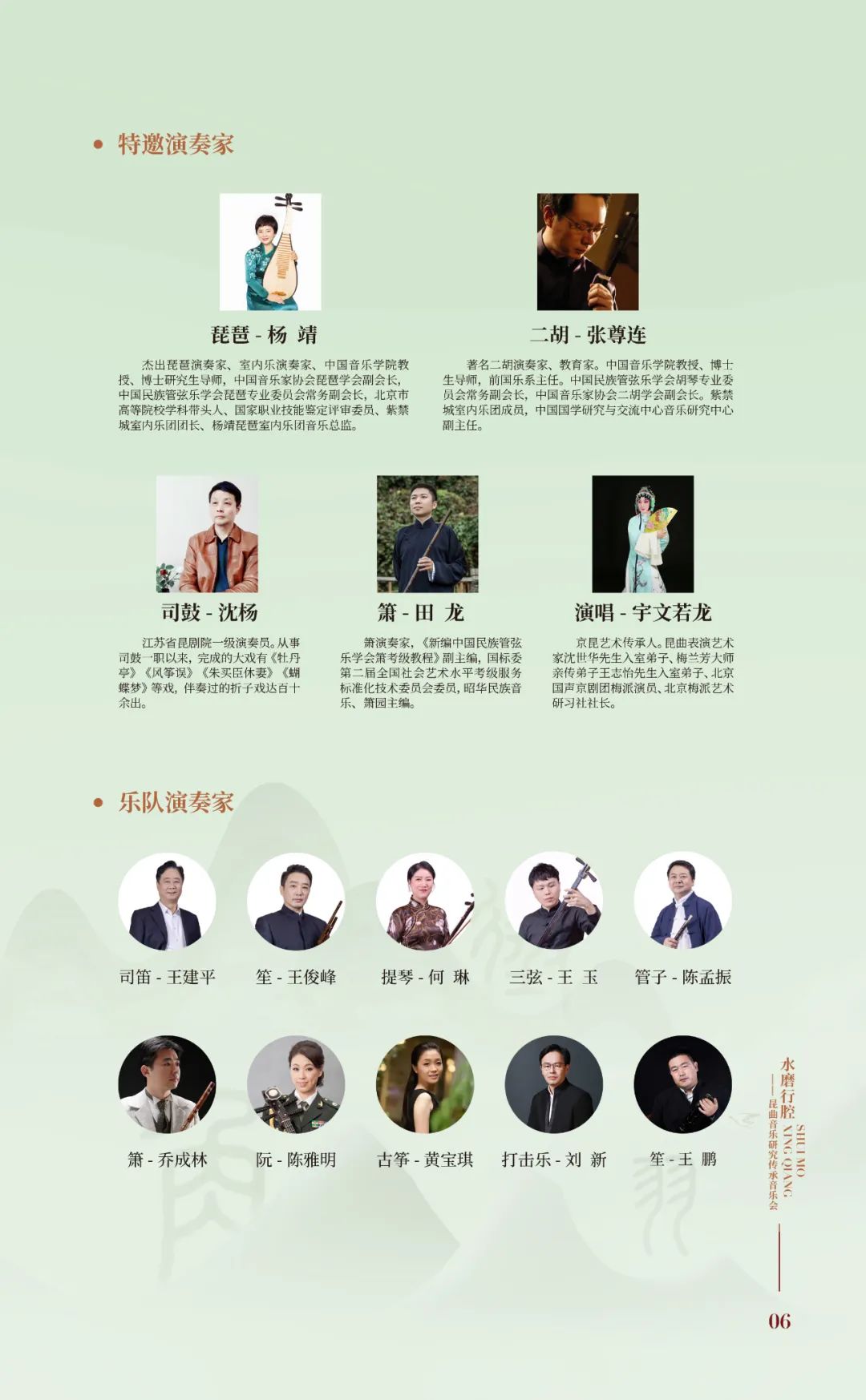 司笛:王建平 司鼓:沈杨 琵琶:杨靖 二胡:张尊连 箫:田龙、乔成林 笙:王俊峰、王鹏 提琴:何琳 三弦:王玉 管子:陈孟振 阮:陈雅明 古筝:黄宝琪 打击乐:刘新、孙建安
