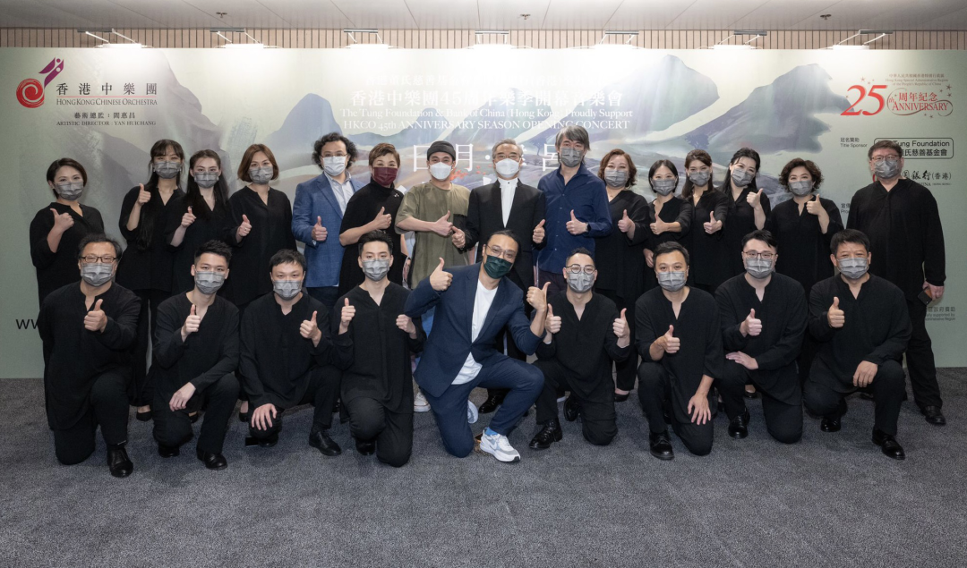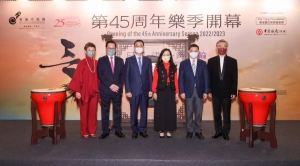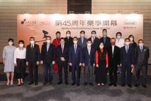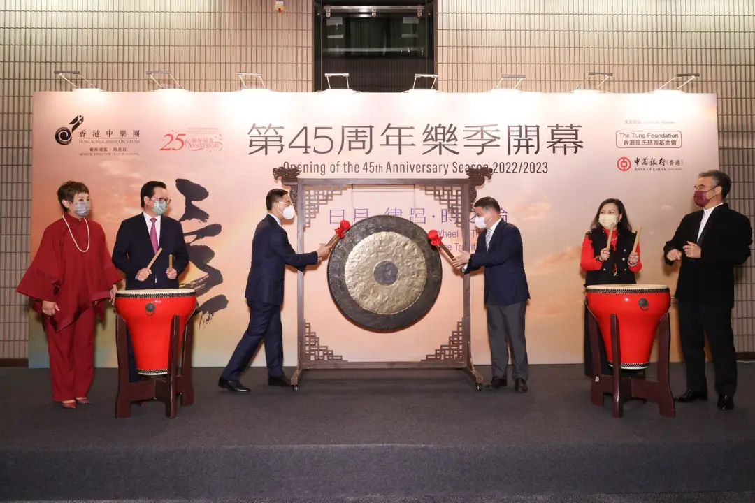 开幕典礼中,艺术总监兼终身指挥阎惠昌教授及行政总监钱敏华博士陪同文化体育及旅游局局长杨润雄先生、中联办宣传文体部副部长张国义先生、立法会议员/中国银行(香港)总法律顾问简慧敏女士及香港中乐团理事会主席陈伟佳博士,为45周年乐季揭开序幕。