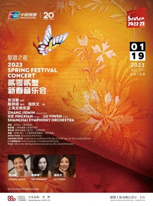 2023年1月19日,上海交响乐团2023新春音乐会将由驻团指挥张洁敏执棒,携手二胡演奏家陆轶文,演绎陈其钢二胡协奏曲《悲喜同源》,也是该作品在上海的首演;本场音乐会还将有三首亚洲/世界首演的作品,由青年作曲家周天创作的《升华》、作曲家李从军创作的钢琴协奏曲《李白》以及青年音乐家俞极创作的《丝路·颂》,为听众带来难得的全场新体验。